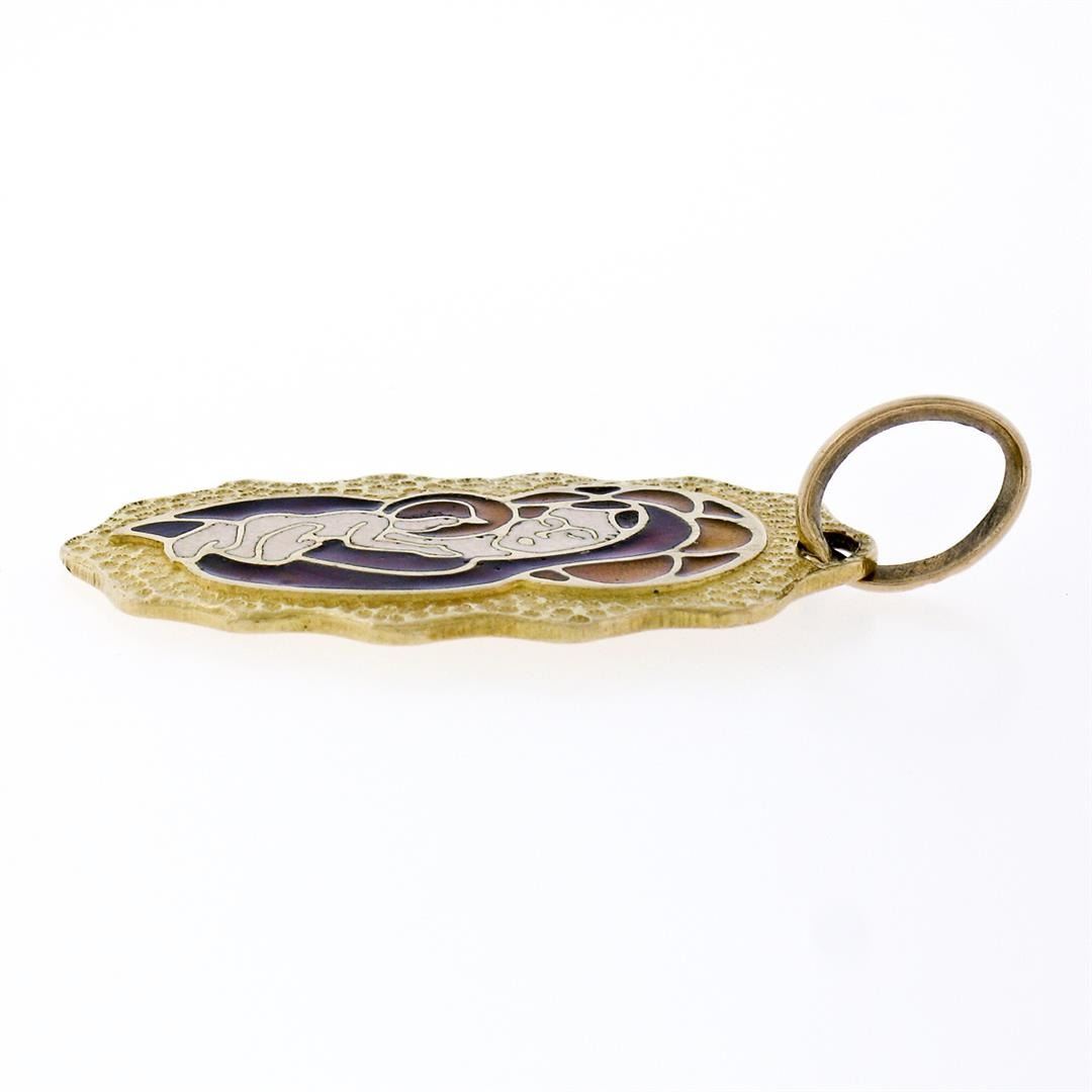 Vintage Eftepi Depose 18K Yellow Gold Mosaic Enamel Mother Mary & Jesus Pendant. Please see photos and description for all available information. A vintage solid 18k yellow gold mother mary & jesus pendant by Eftepi Depose, with enamel work. The pendant weighs a total of 5.0 grams, measures 35.0x15.60mm including the bail, and the inside of the bail measures 6.0x4.65mm.