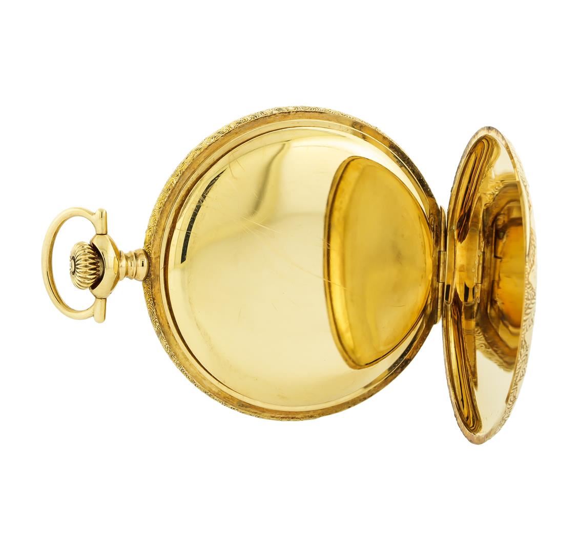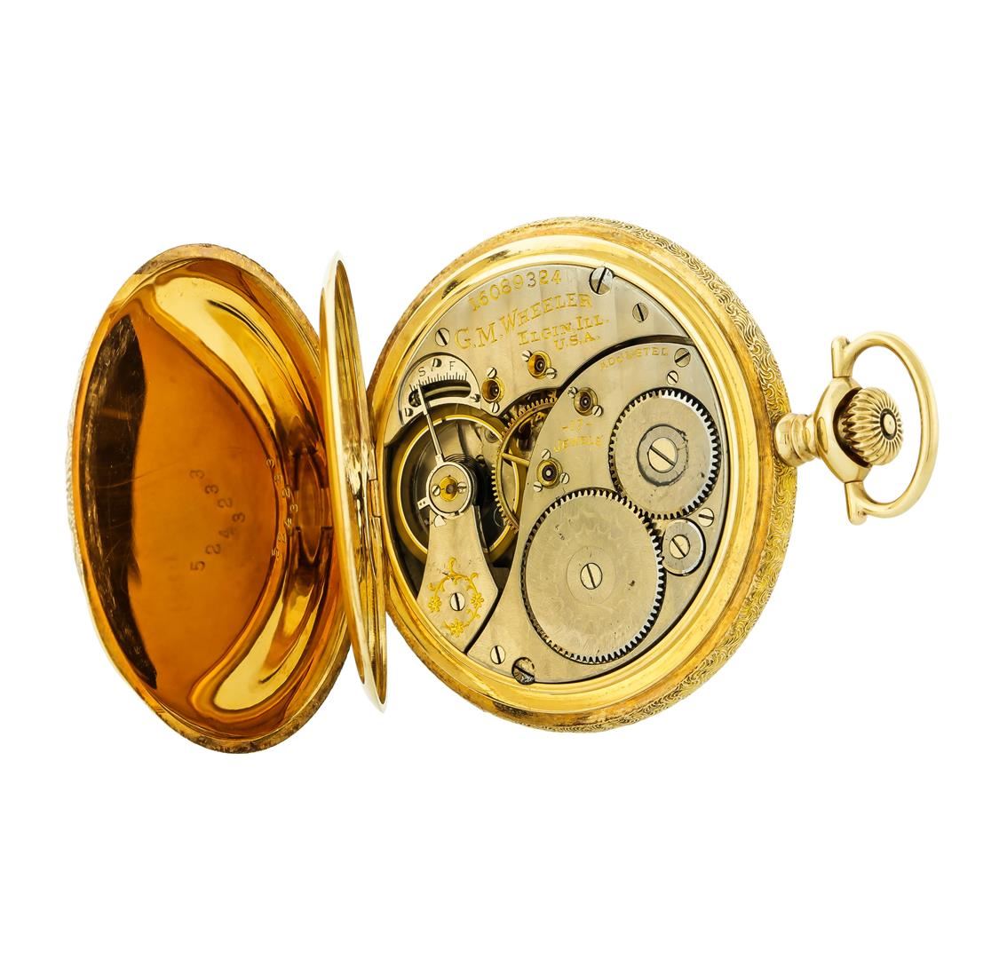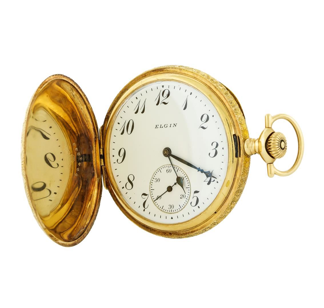 One Elgin vintage 14KT Yellow Gold Pocketwatch. Movement: Elgin, mechanical with manual winding, serial number 16089324. Case: Hunter, 14KT Yellow Gold engraved on both sides, measures 45mm in diameter, case number 5243233. Case signed "14K 0.585". Dial: White enamel with painted Arabic numerals and blued steel hands. Seconds sub-dial is located at 6 o'clock. Condition: G-4 FINE, (good working order and good condition). Total Weight of Watch: 65.00gm.