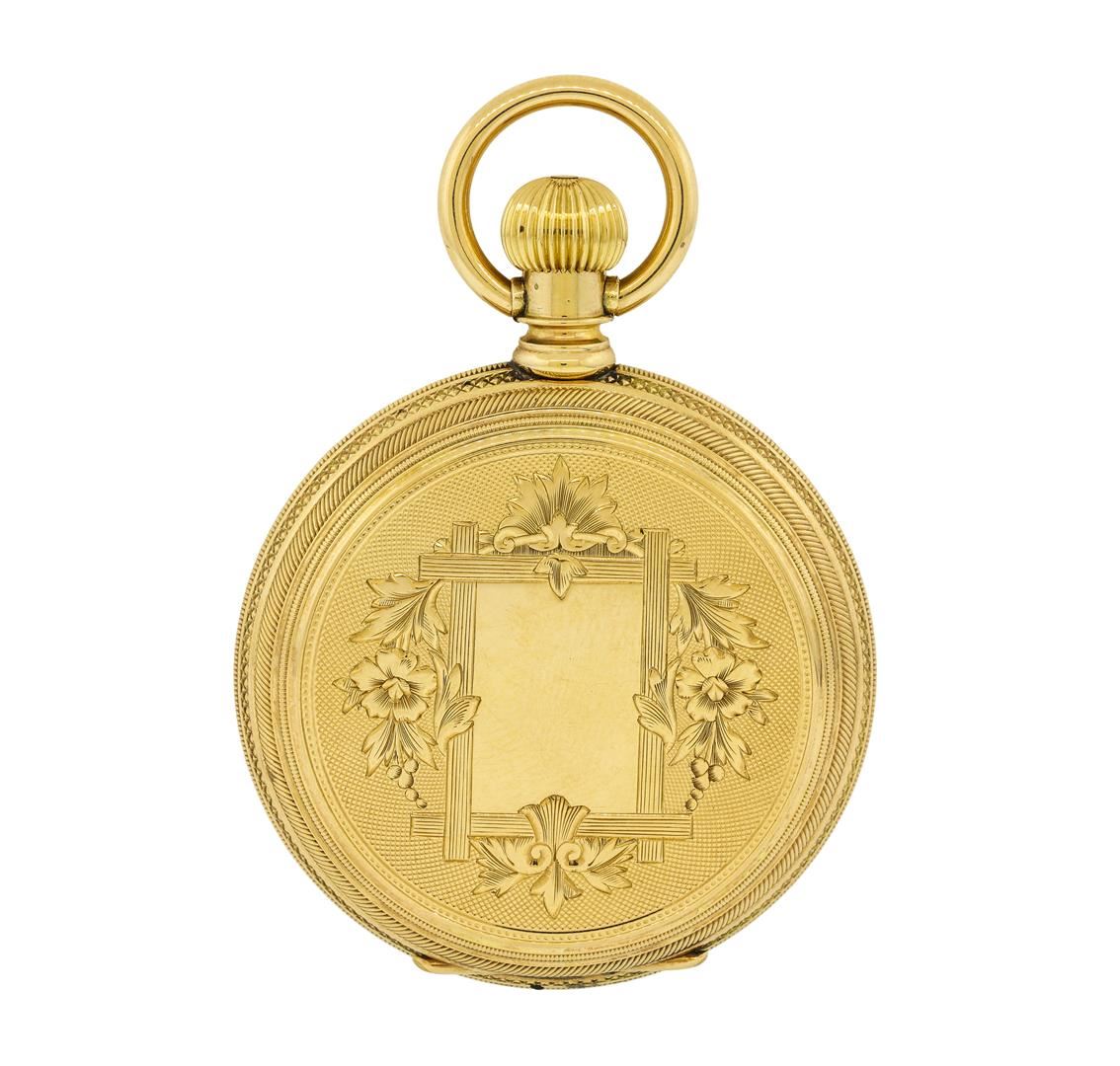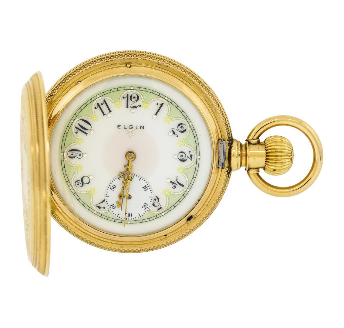 One Elgin vintage 14KT Yellow Gold Pocketwatch. Movement: Elgin mechanical with manual winding, serial number 2408579. Case: Hunter, 14KT yellow gold engraved on both sides, measures 52mm in diameter, case number 14073. Case signed "14K" and engraved "Charles C. Fries". Dial: White and green enamel with painted Arabic numerals and "Louis XV" hands. Seconds sub-dial is located at 6 o'clock. Condition: G-4 FINE, (good working order and good condition). Total Weight of Watch: 118.00gm.