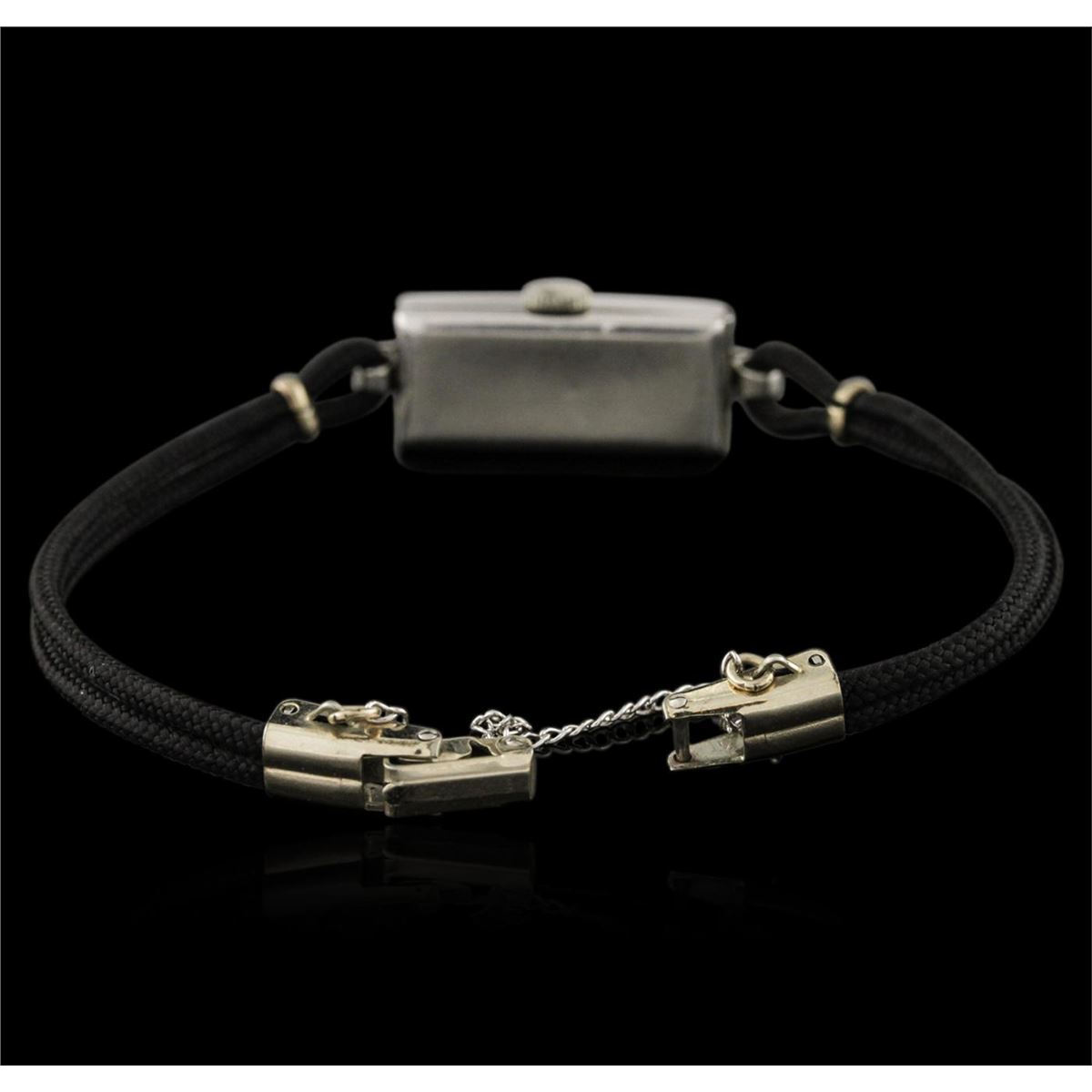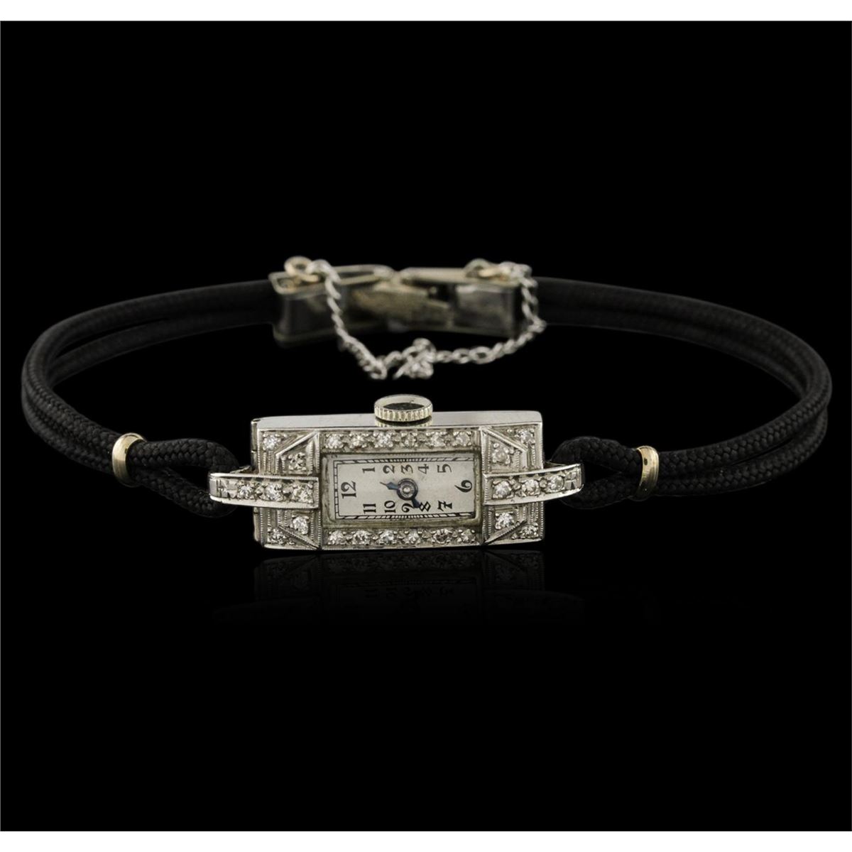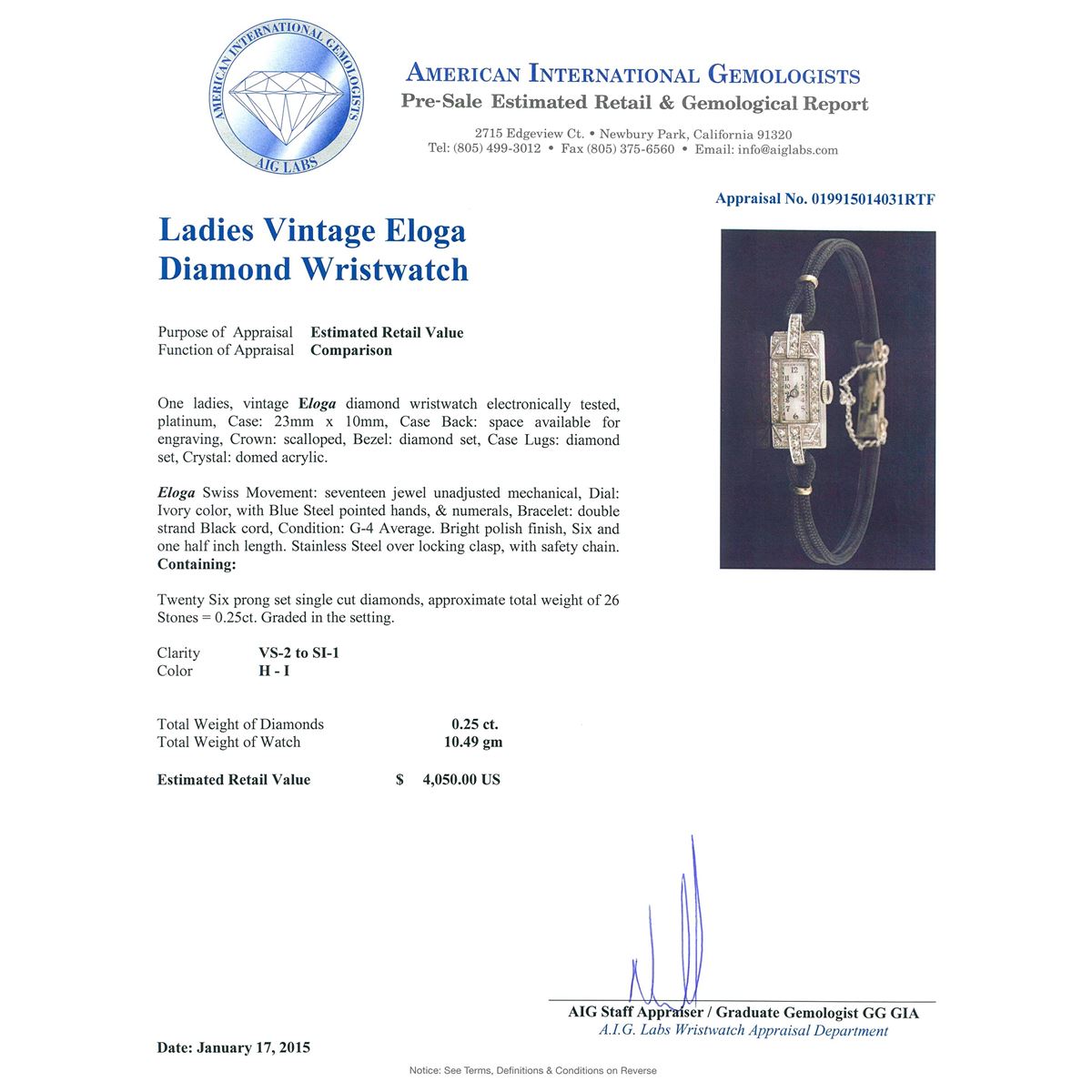 One ladies, vintage Eloga diamond wristwatch electronically tested, platinum, Case: 23mm x 10mm, Case Back: space available for engraving, Crown: scalloped, Bezel: diamond set, Case Lugs: diamond set, Crystal: domed acrylic. Eloga Swiss Movement: seventeen jewel unadjusted mechanical, Dial: Ivory color, with Blue Steel pointed hands, & numerals, Bracelet: double strand Black cord, Condition: G-4 Average. Bright polish finish, Six and one half inch length. Stainless Steel over locking clasp, with safety chain. Containing: Twenty Six prong set single cut diamonds, approximate. Total Weight of 26 Stones = 0.25ct. Graded in the setting. Clarity: VS-2 to SI-1. Color: H - I. Total Weight of Diamonds 0.25ct. Total Weight of Watch 10.49 grams. AIG Appraised at $4,050.00.