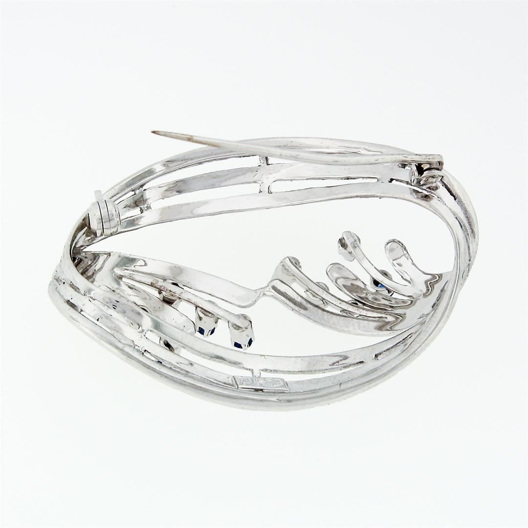 A vintage solid 18k white gold brooch, with 10 round cut natural sapphire (0.30ctw). Measures 28.76x41.04mm and weighs a total of 9.24 grams.