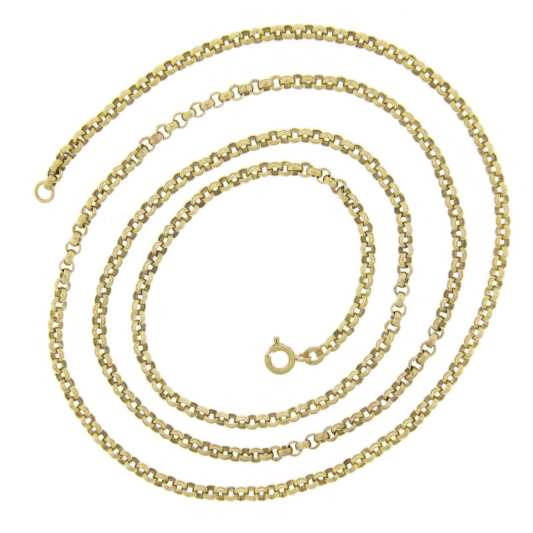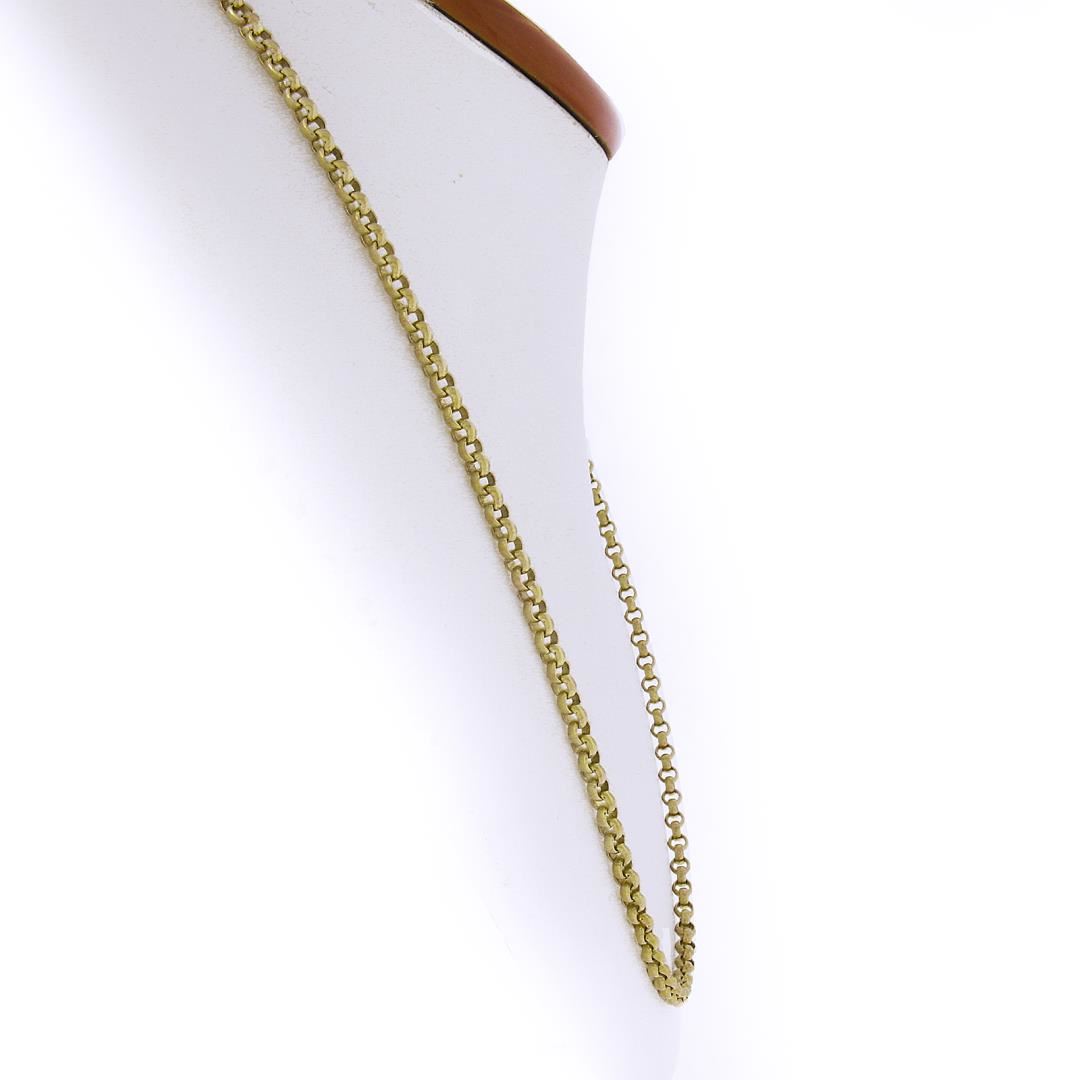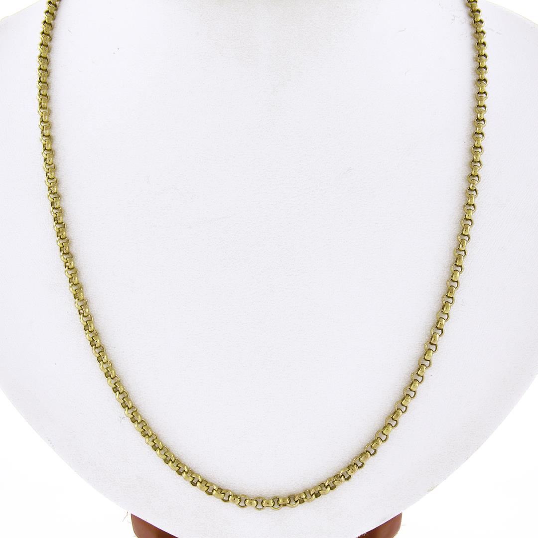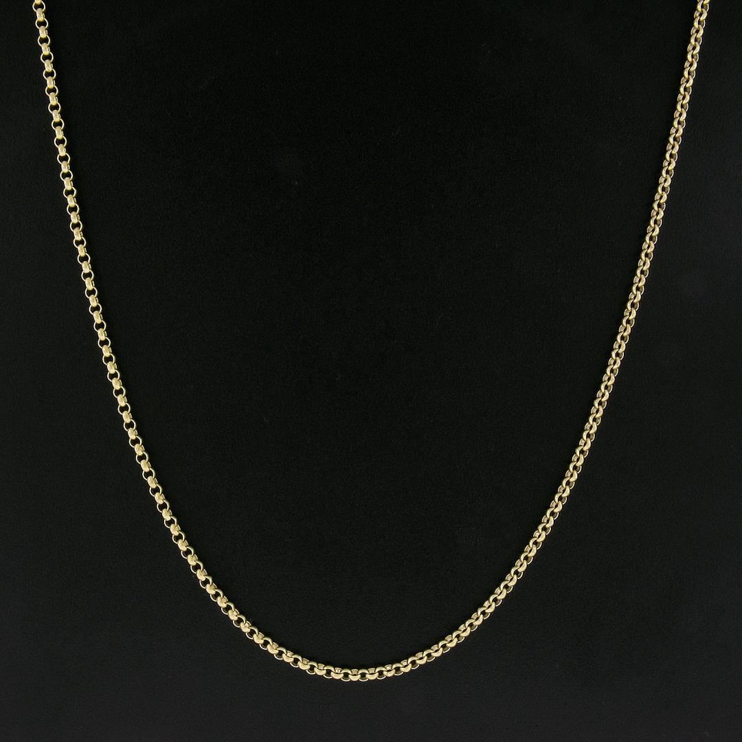 A vintage solid 9k yellow gold rolo link necklace. It weighs a total of 18.38 grams, measures 3.1mm wide, and measures 29.5 inches in length.