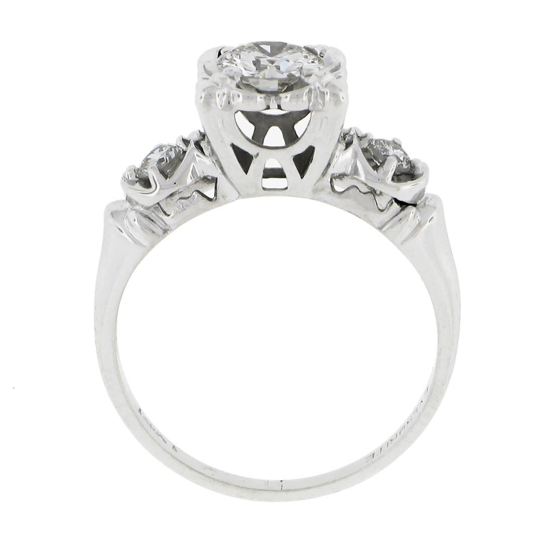 A vintage solid 14k white gold engagement ring by Everbrite, with 1 old transitional cut natural diamond (I- SI2-I1 ; 0.70ct ), and 2 round cut natural diamonds (H/I - SI2-I1 ; 0.14ctw). The ring is size 7.0, weighs a total of 3.41 grams, and measures 8mm wide.