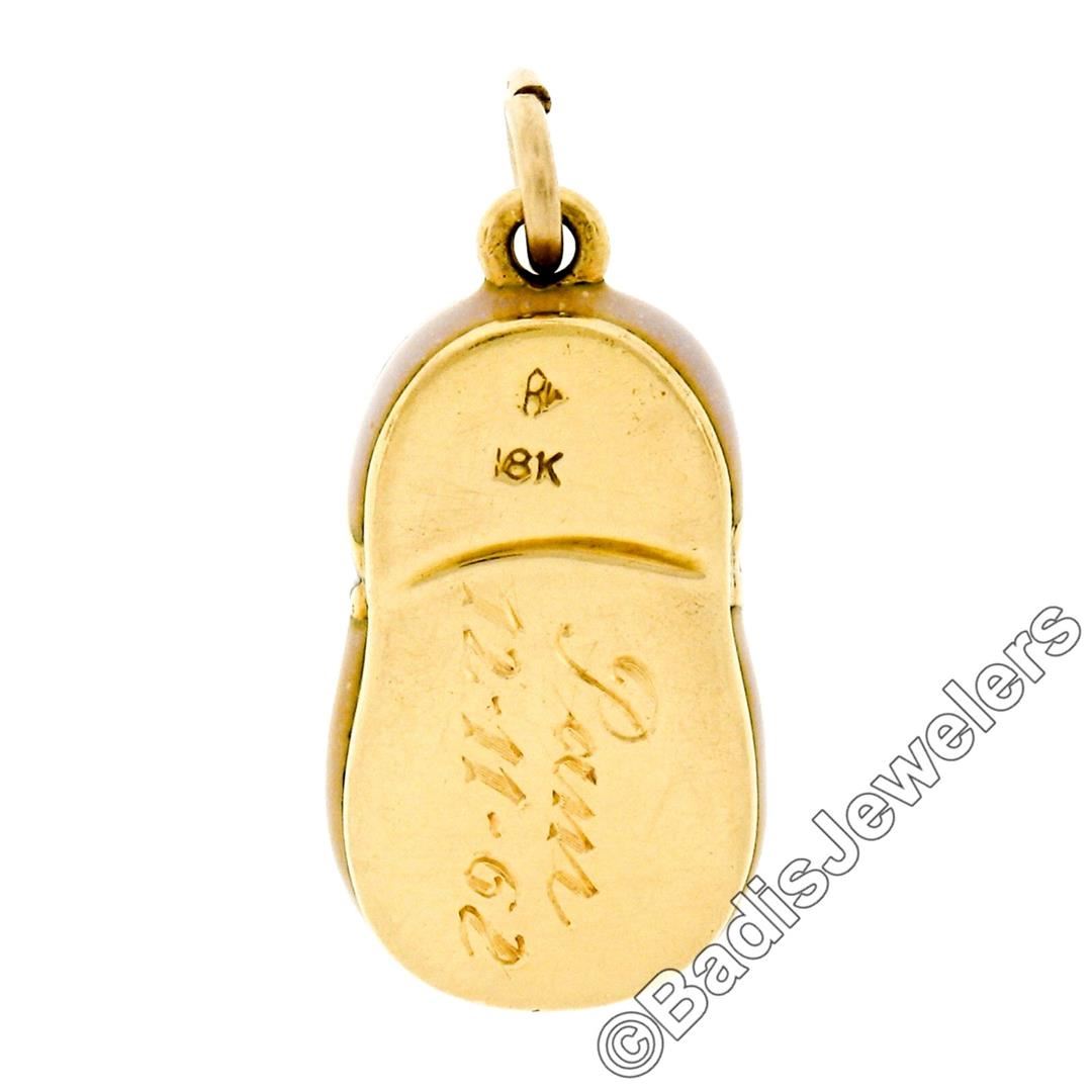 A vintage solid 18k yellow gold and enamel baby shoe pendant charm by Felix Vollman.The pendant weighs a total of 7.33 grams, measures 27.95x11.74mm including the bail, and the inside of the bail measures 4.3x3.0mm.
