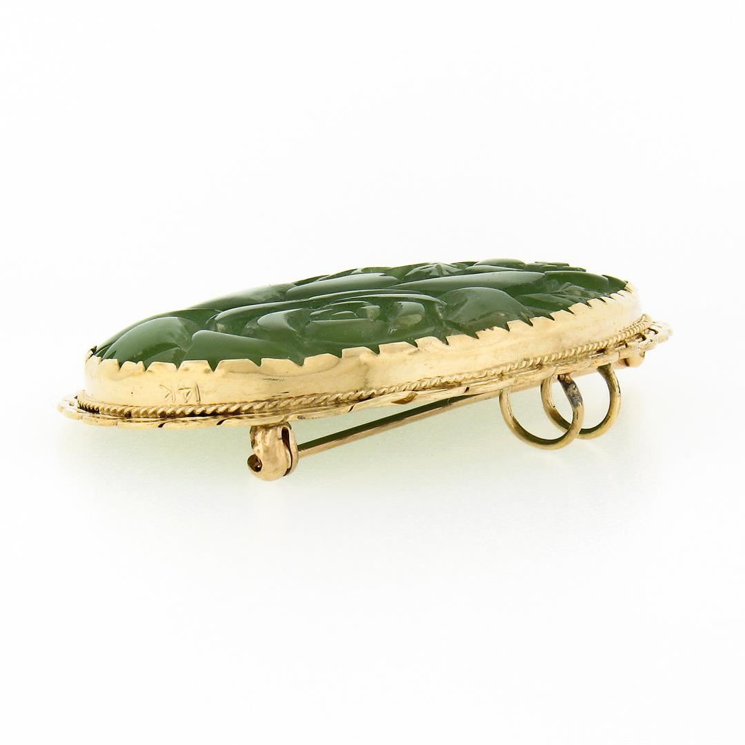 A vintage solid 12k yellow gold frame brooch pendant, with 1 carved natural jade (45.4x30mm). Measures 36x50.2mm and weighs a total of 12.79 grams, and bail diameter inside 4.7mm.