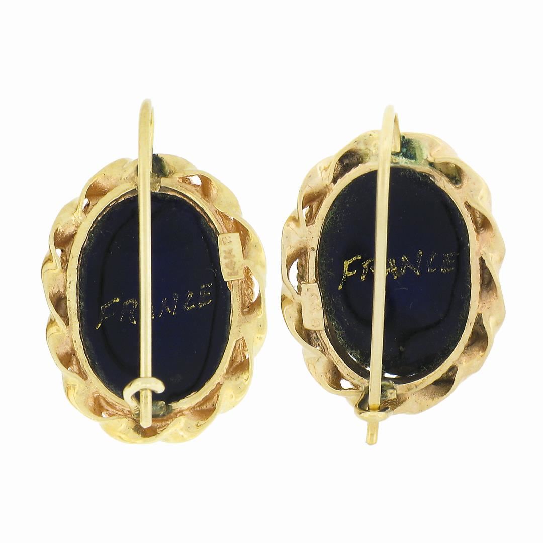 A vintage solid 14k yellow gold earrings, with 2 hand painted porcelain portrait. The earrings measure approximately 23.5x15.70mm and weigh a total of 5.81 grams.