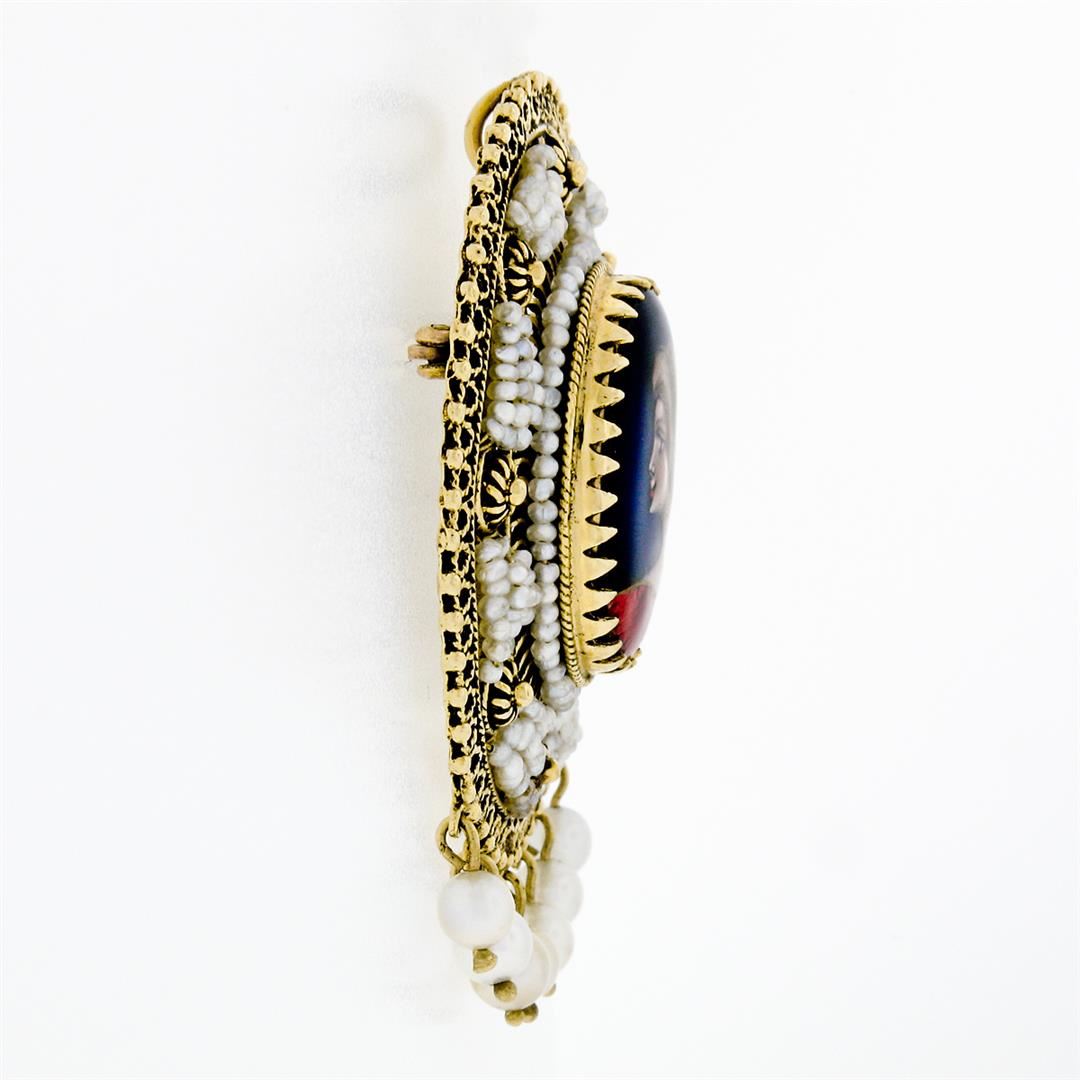 A vintage solid 14k yellow gold portrait brooch pendant, with numeral of natural seed pearls. Measures 51.2x37.4mm and weighs a total of 13.38 grams.