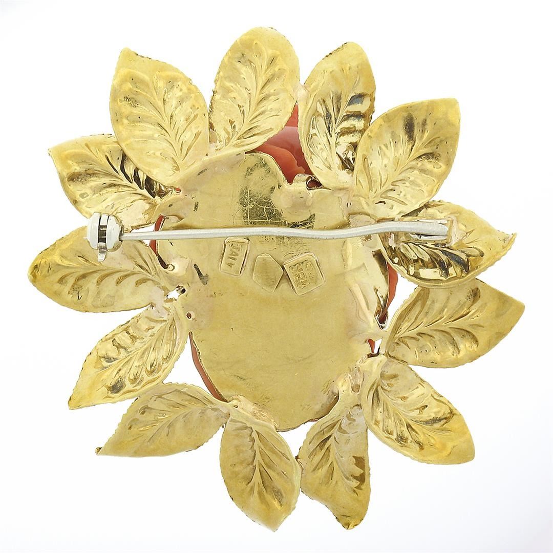 A solid 18k yellog odl pin brooch, with 1 Gia certified carved rose shape natural coral (28.45 x 23.01 x 14.43 mm - 22.65 grams). Measures 46.25x45.20mm and weighs a total of 22.65 grams. Comes with all original relevant certifications.