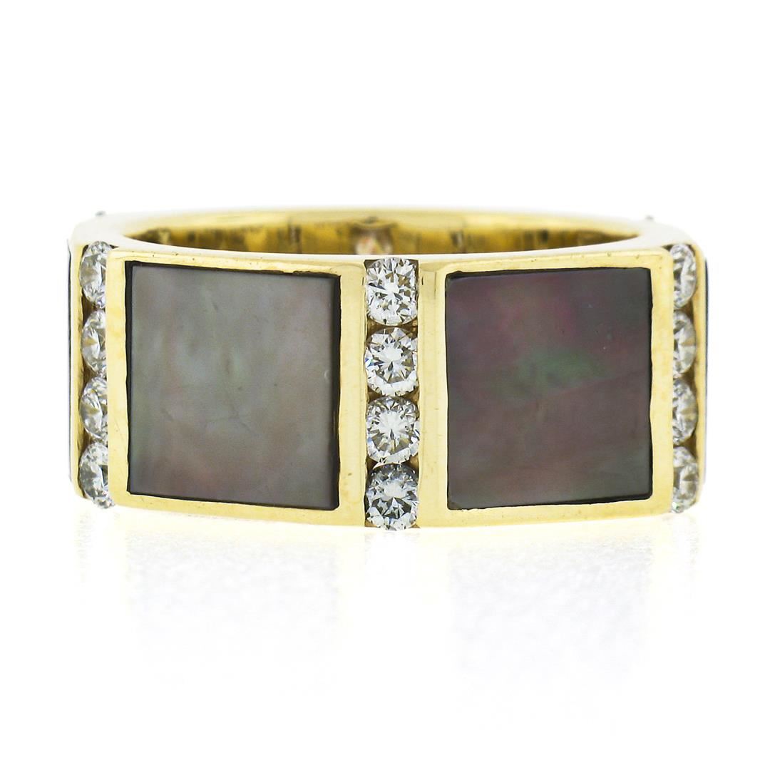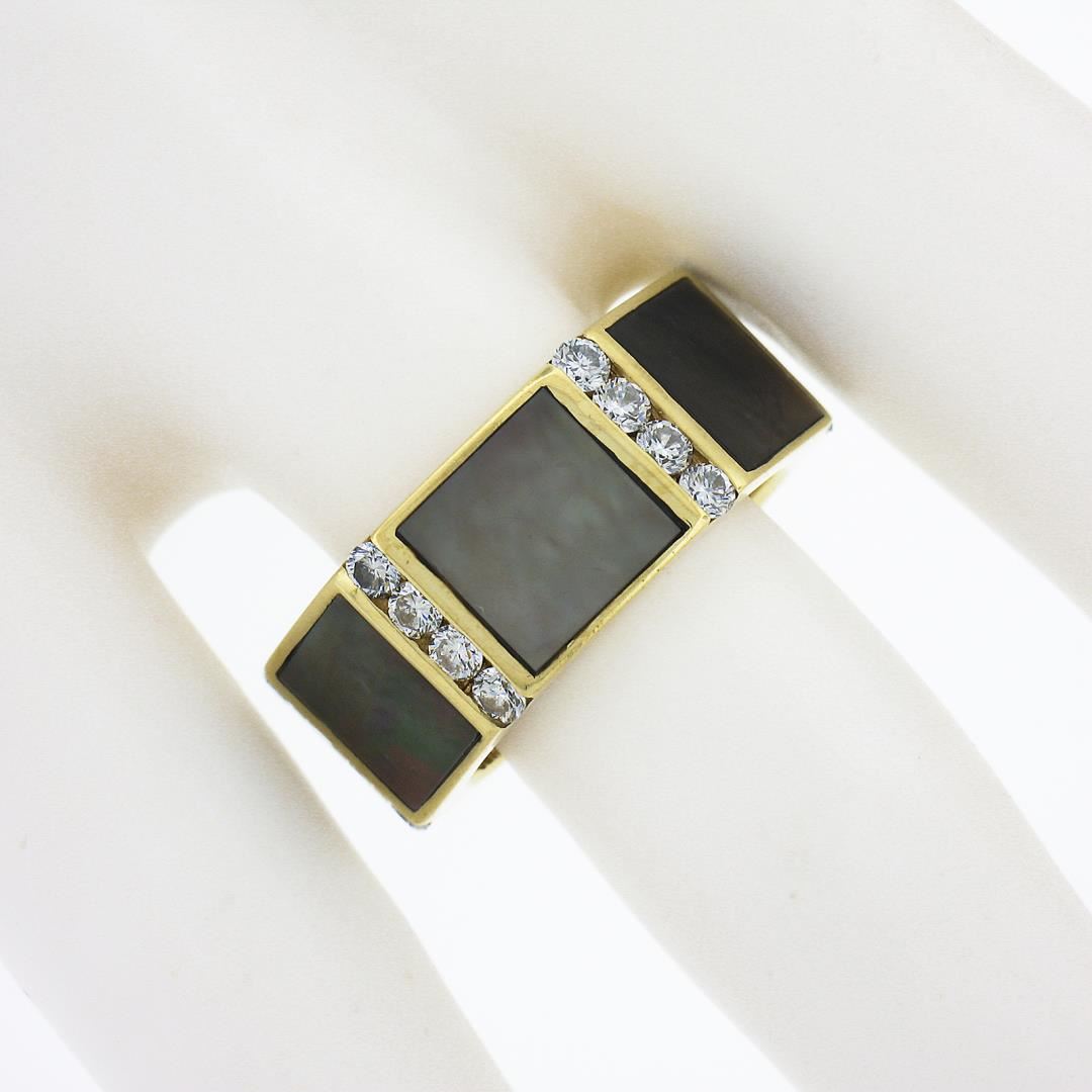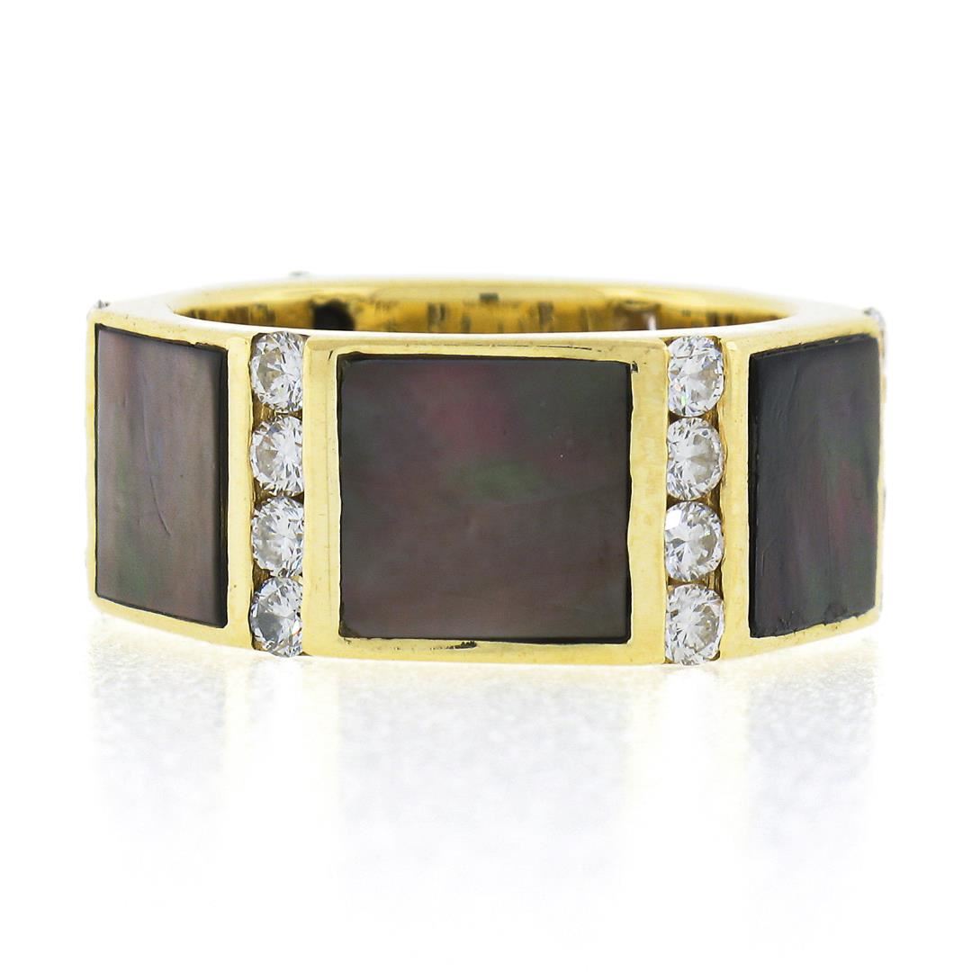 A vintage solid 18k yellow gold band ring by gemlok, with 6 inlaid black mother of pearls (7.8x7.8mm each), and 24 round cut natural diamonds (G-H - VS1-VS2 ; 1.0ctw). The ring is size 6.5, weighs a total of 10.11 grams, and measures 8.9mm wide.