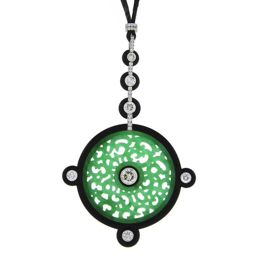 Vintage Georg Hornemann Carved Jadeite Jade Black Onyx Diamond Pendant Necklace