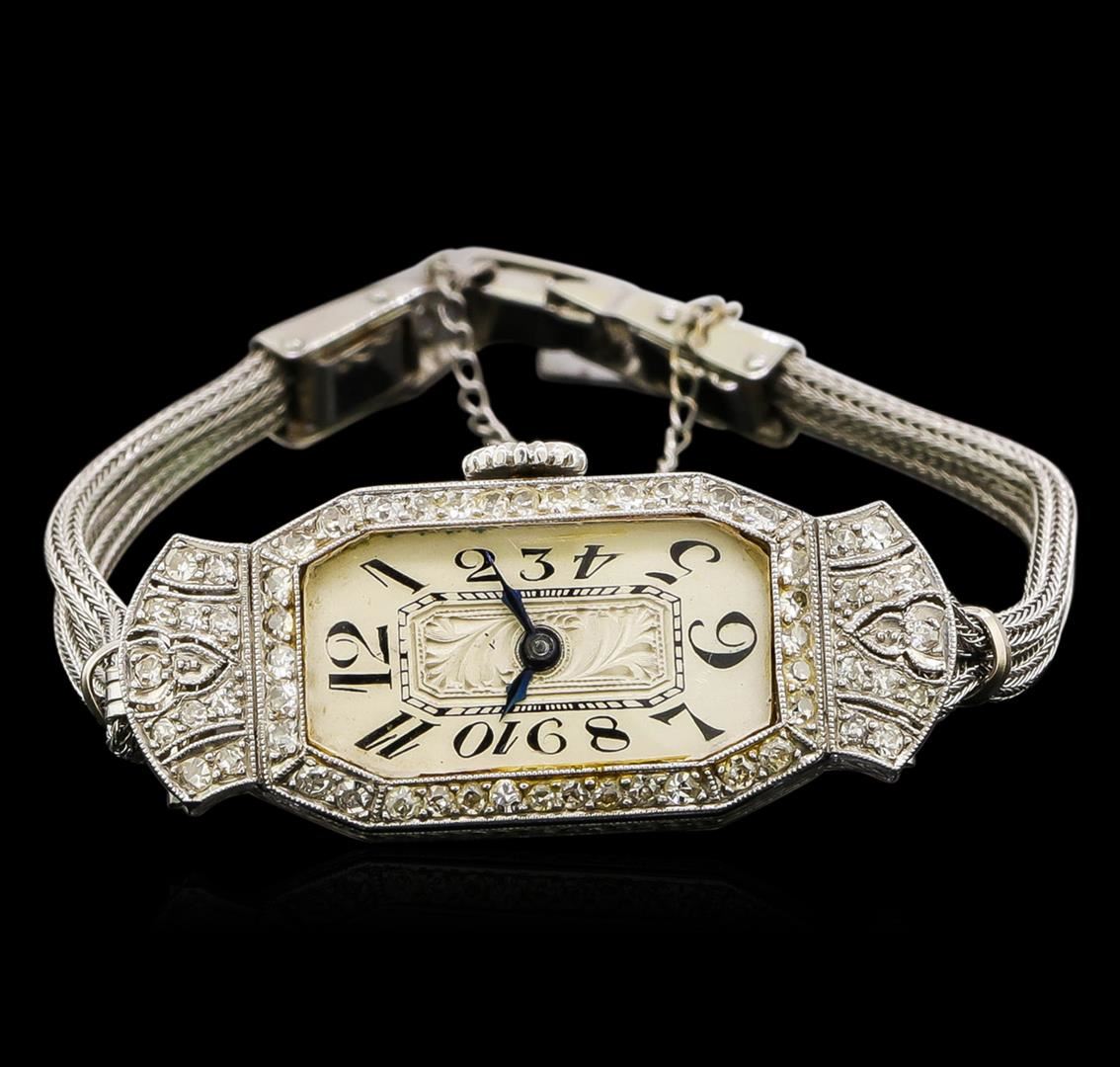 One ladies, cast & assembled Vintage Glycine wristwatch electronically tested, Platinum Case: 24mm x 14mm, Case Back: space available for engraving, Case Lugs: diamond set, Bezel: diamond set, Crystal: acrylic. Glycine Movement: seventeen jewel three adjustment mechanical, Dial: Ivory color, with Blue Steel pointed hands, and numerals, Condition: G-4 average. Bracelet: 14KT white gold double mesh cord strap, six inch length, with a fold over stainless steel snap locking clasp. Containing: Fifty Eight single cut diamonds, approximate. Total Weight of 58 stones = 0.55ct. Graded in the setting. Clarity: SI-1 to I-1. Color: G - I. Total Weight of Diamonds 0.55ct. Total Weight of Watch 16.24 grams. AIG Appraised at $5,880.00.