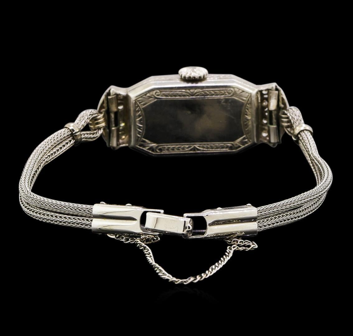 One ladies, cast & assembled Vintage Glycine wristwatch electronically tested, Platinum Case: 24mm x 14mm, Case Back: space available for engraving, Case Lugs: diamond set, Bezel: diamond set, Crystal: acrylic. Glycine Movement: seventeen jewel three adjustment mechanical, Dial: Ivory color, with Blue Steel pointed hands, and numerals, Condition: G-4 average. Bracelet: 14KT white gold double mesh cord strap, six inch length, with a fold over stainless steel snap locking clasp. Containing: Fifty Eight single cut diamonds, approximate. Total Weight of 58 stones = 0.55ct. Graded in the setting. Clarity: SI-1 to I-1. Color: G - I. Total Weight of Diamonds 0.55ct. Total Weight of Watch 16.24 grams. AIG Appraised.