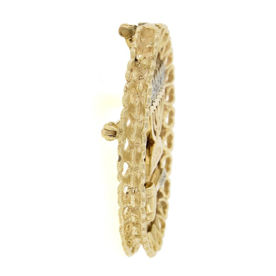 A solid 14k yellow gold brooch pendant, with 10 old single cut natural diamonds (H/I - SI1-I1 ; 0.15ctw). Measures 39.1x31.9mm and weighs a total of 12.35 grams.