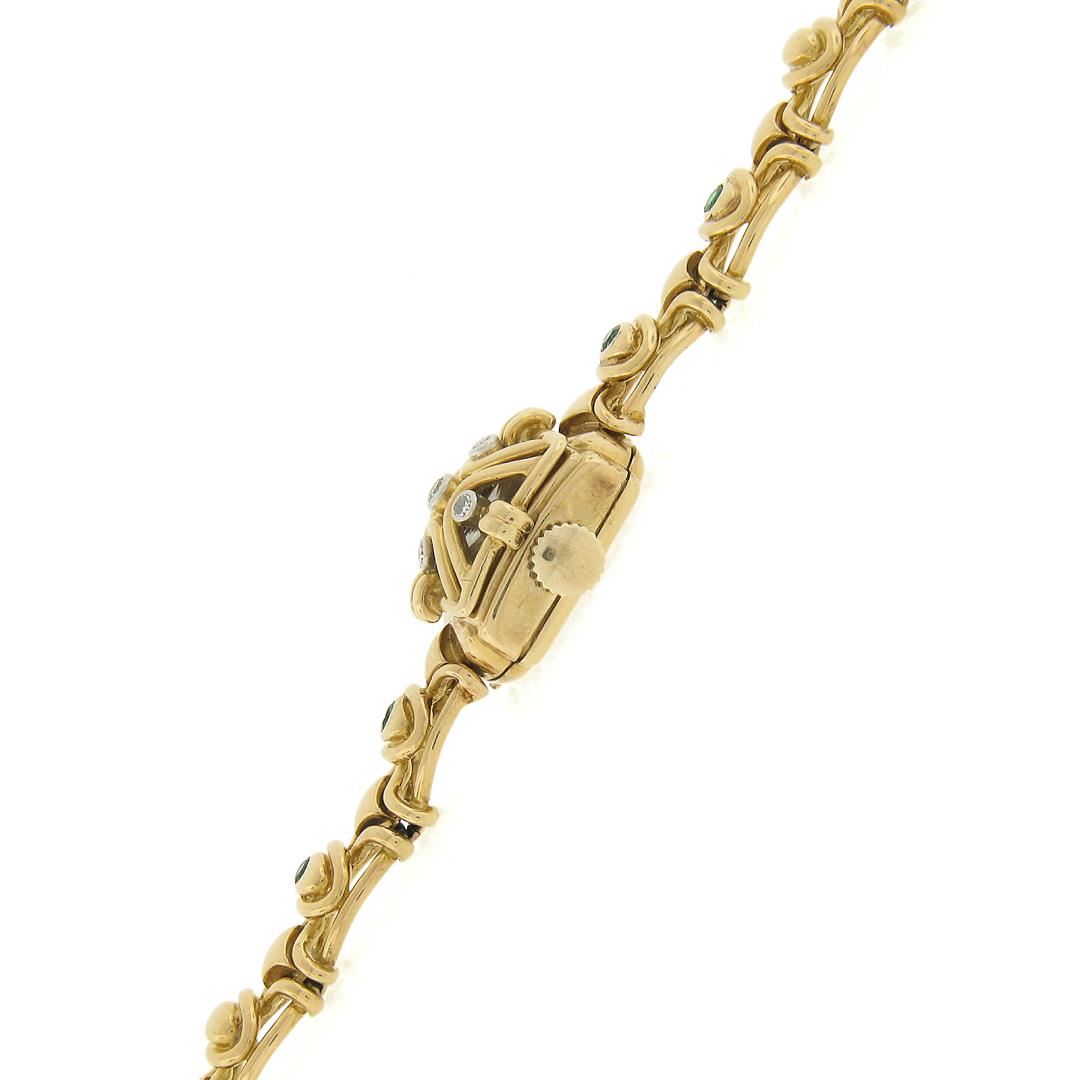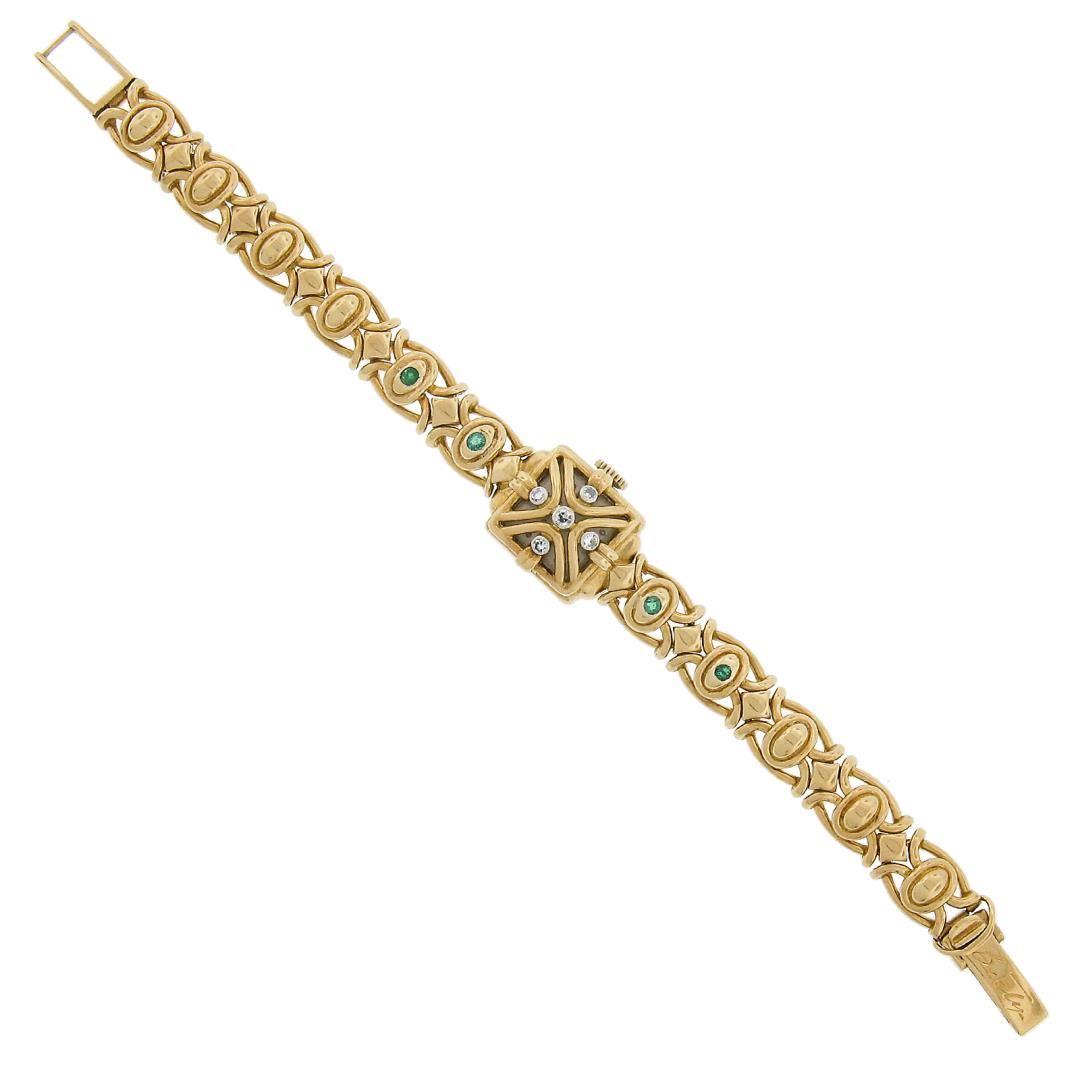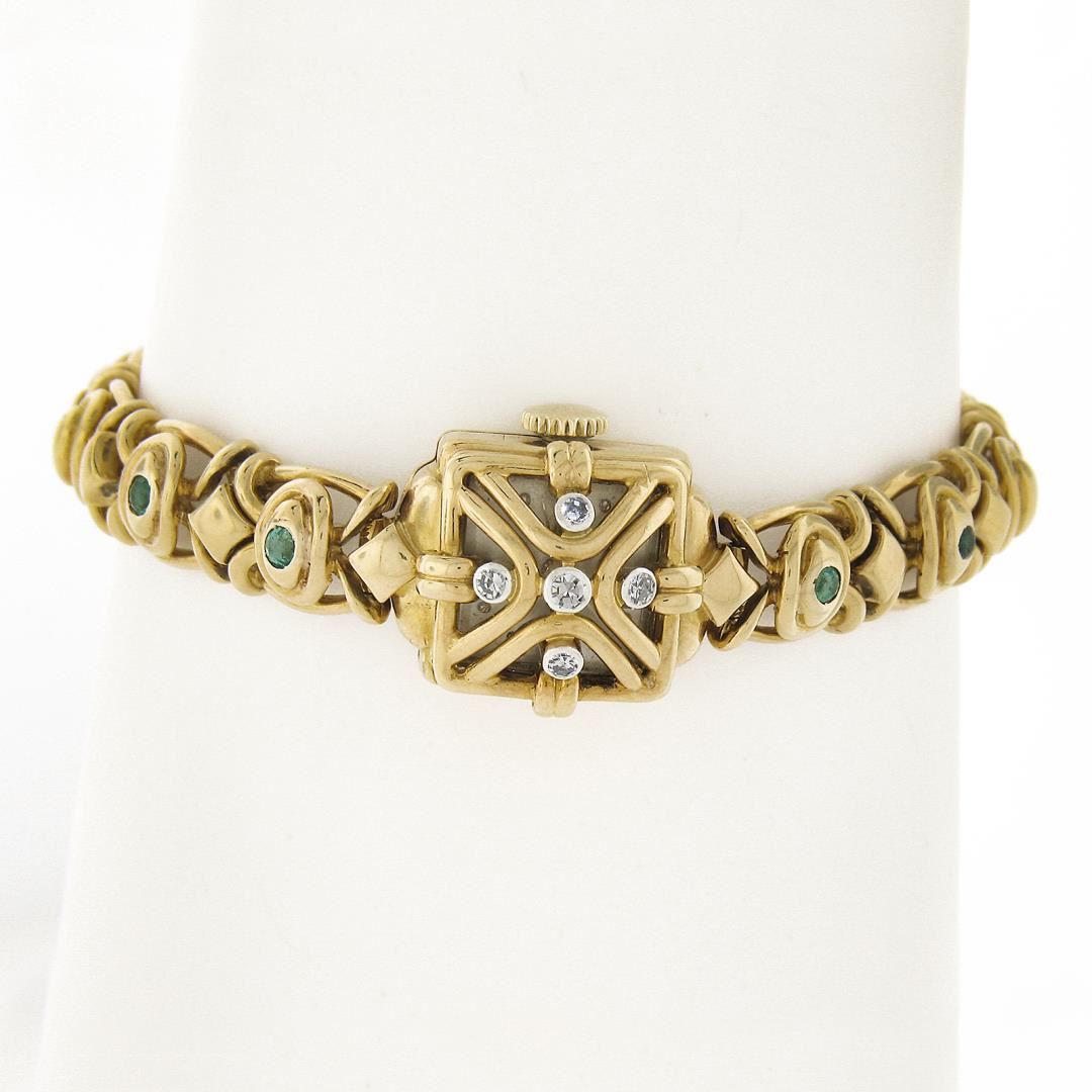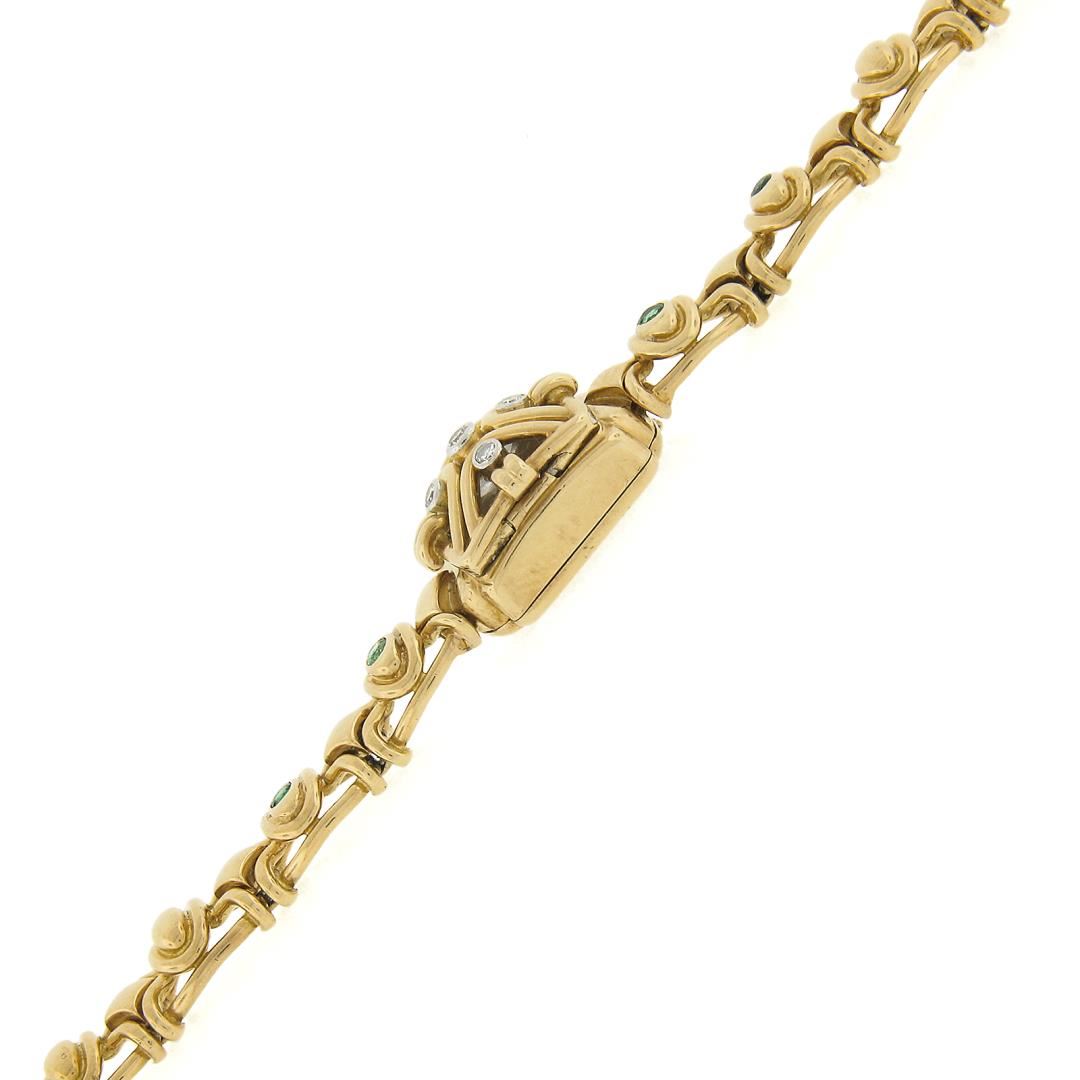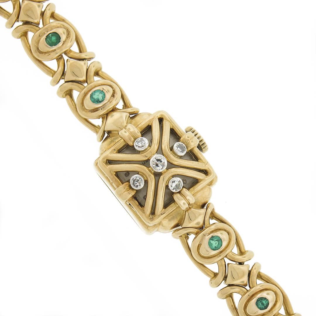 A vintage solid watch bracelet by Gubelin, featuring 5 single cut natural diamonds, and 4 round cut natural emeralds. It weighs a total of 33.7 grams, measures 14mm wide, and measures 6.5 inches in length.