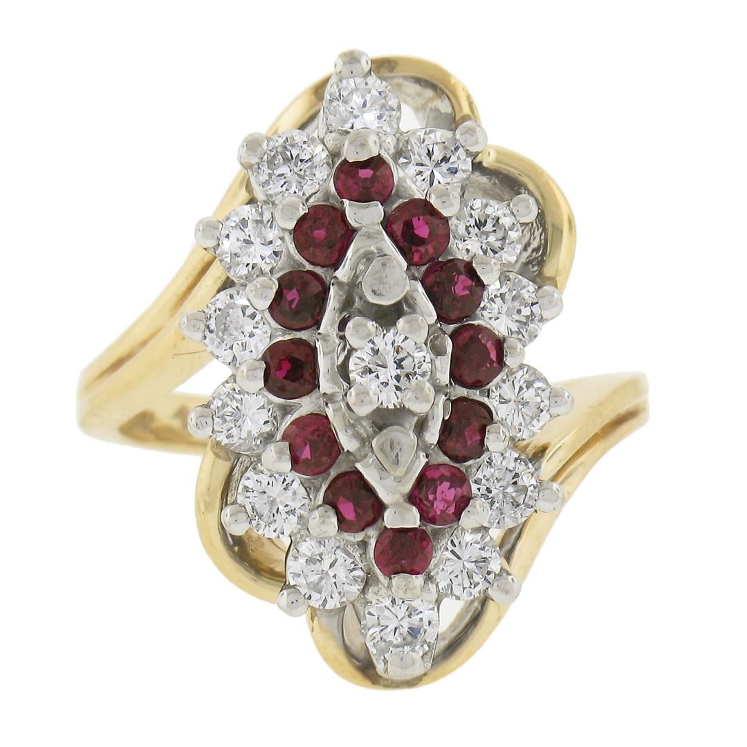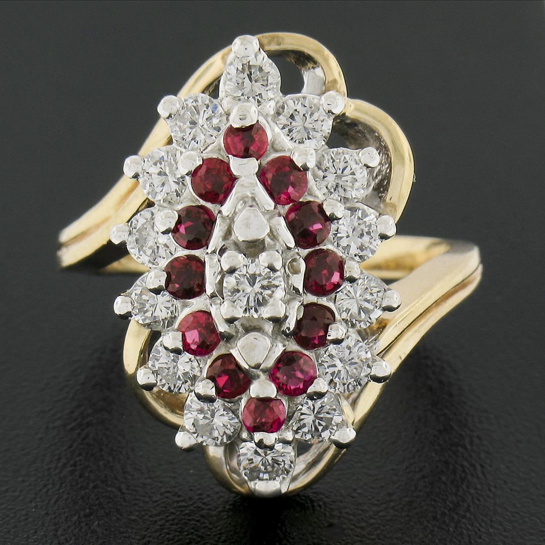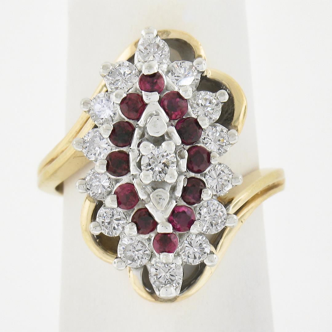 A vintage solid 14k yellow & white gold ring by H. Stern, featuring 12 round cut natrual rubies (0.60ctw), and 15 round cut natural diamonds (E/F - VS2 -SI2 ; 1.0ctw). The ring is size 6.5, weighs a total of 8.27 grams, and measures 21.7mm wide.