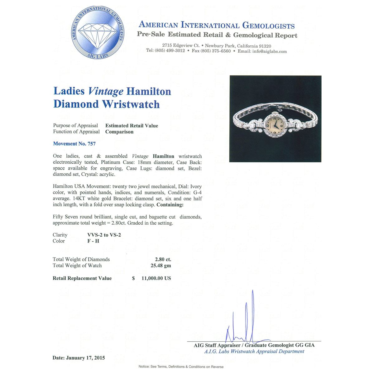 One ladies, cast & assembled Vintage Hamilton wristwatch electronically tested, Platinum Case: 18mm diameter, Case Back: space available for engraving, Case Lugs: diamond set, Bezel: diamond set, Crystal: acrylic. Hamilton USA Movement: twenty two jewel mechanical, Dial: Ivory color, with pointed hands, indices, and numerals, Condition: G-4 average. 14KT white gold Bracelet: diamond set, six and one half inch length, with a fold over snap locking clasp. Containing: Fifty Seven round brilliant, single cut, and baguette cut diamonds, approximate total weight = 2.80ct. Graded in the setting. Clarity: VVS-2 to VS-2. Color: F - H. Total Weight of Diamonds 2.80ct. Total Weight of Watch 25.48 grams. AIG Appraised at $11,000.00.