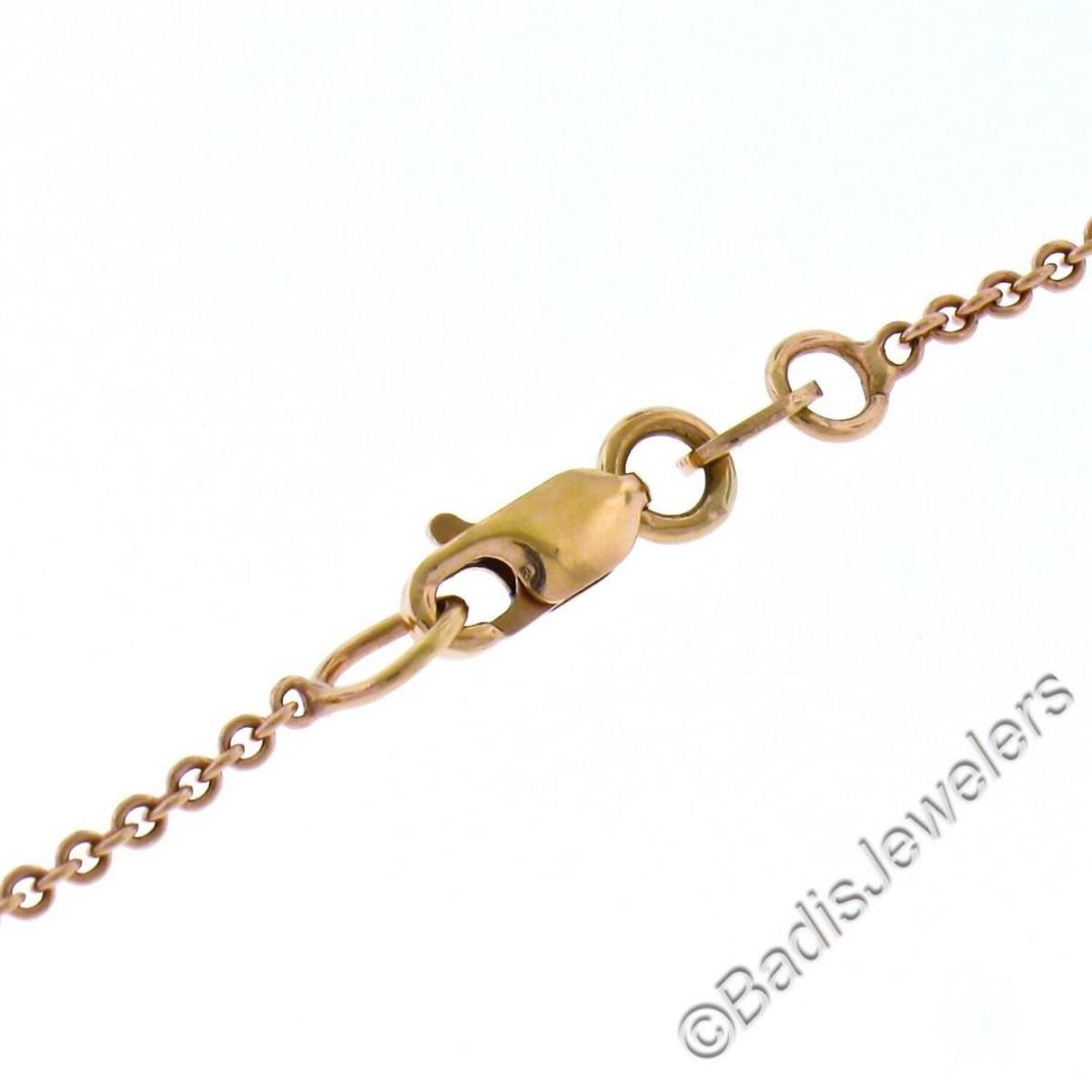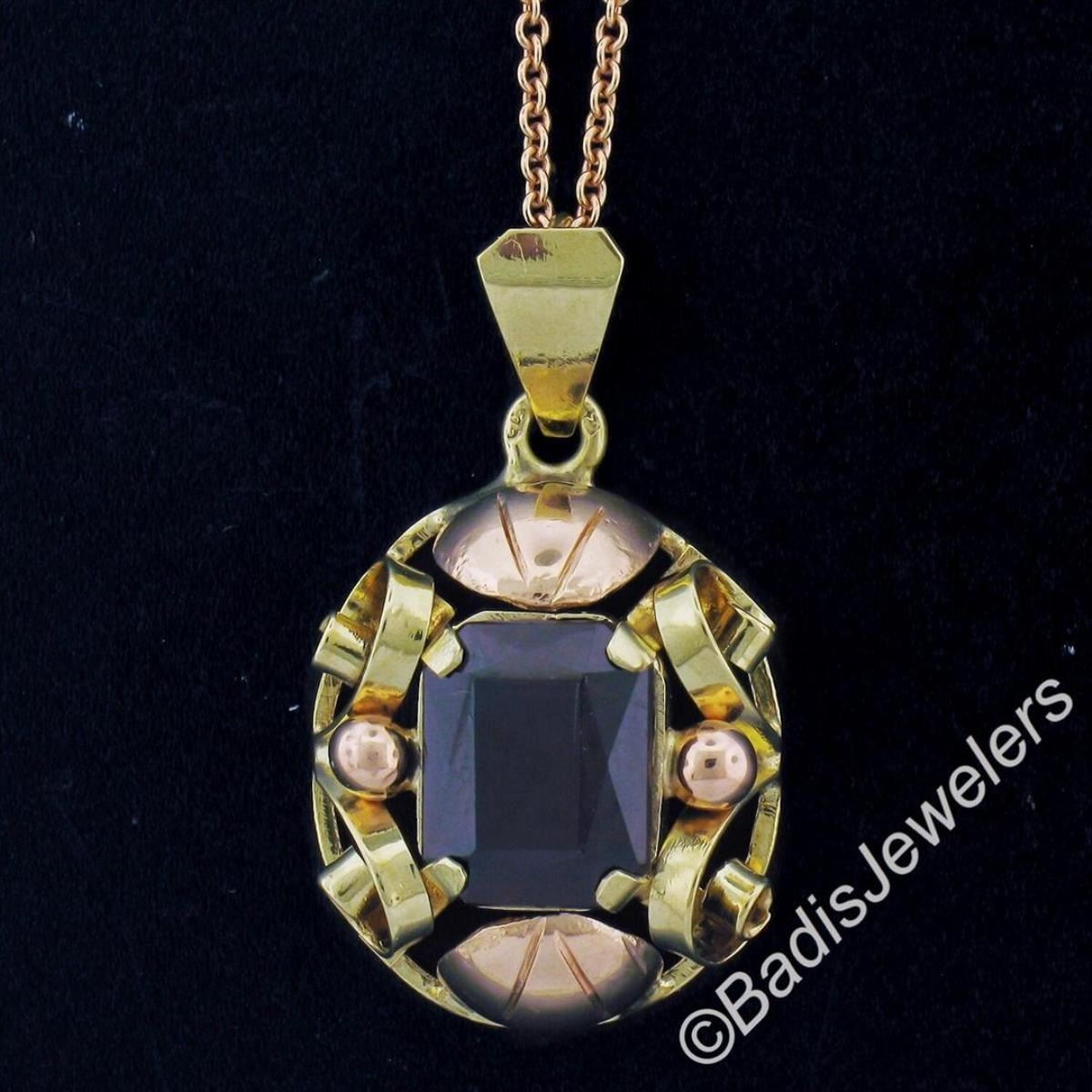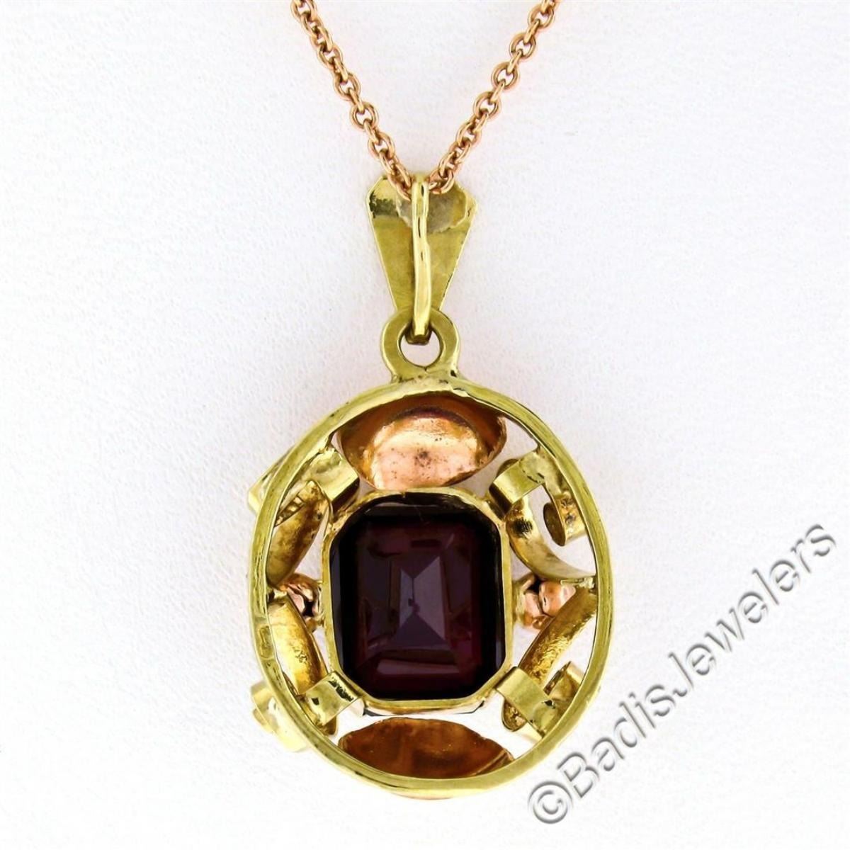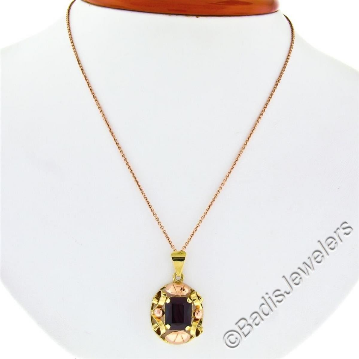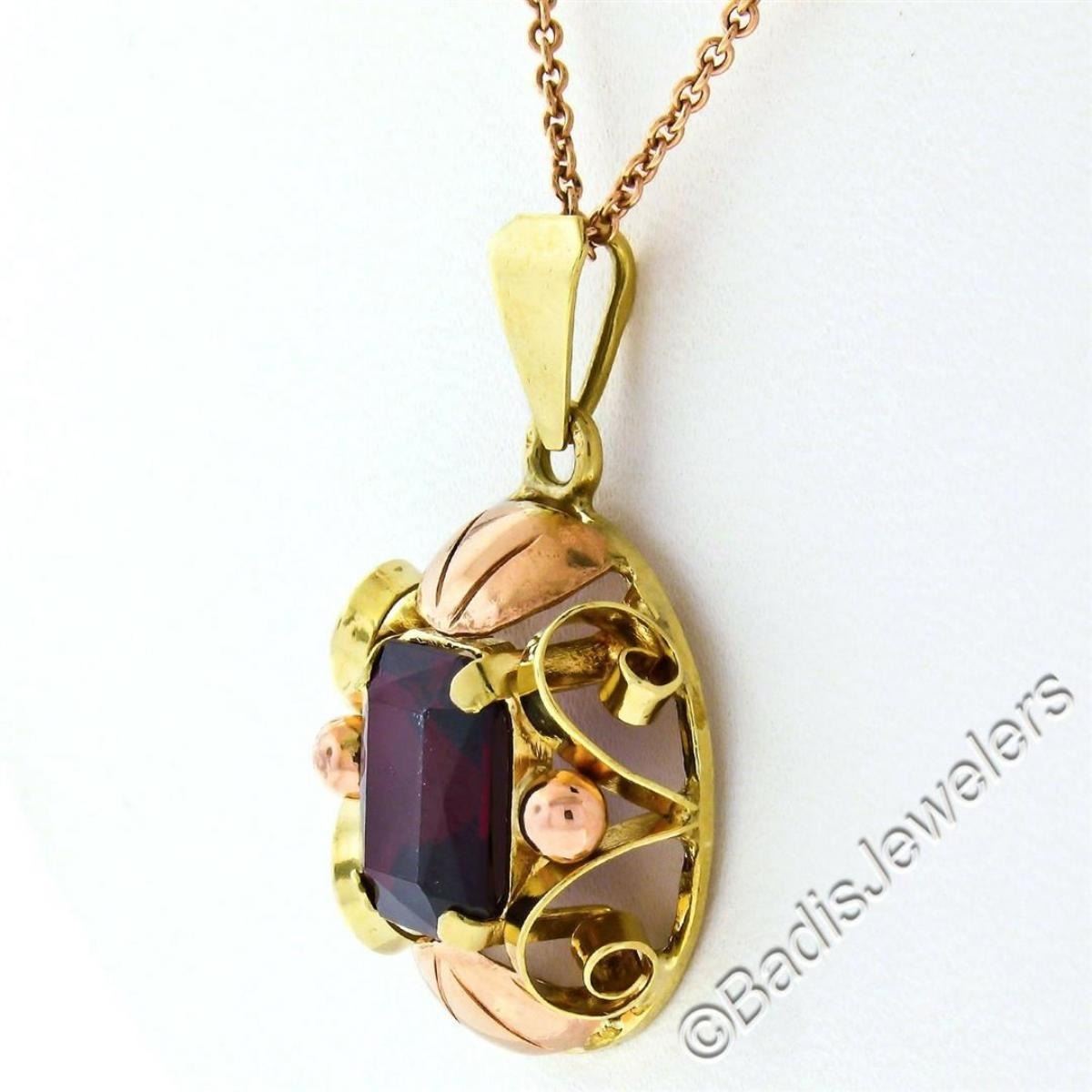 An excellent condition vintage, handmade, 14kt rose and green gold pendant necklace with a 3.50 ct radiant cut garnet. 20 inch cable link chain, 14.90 grams total weight, measures 23.10x16.85mm.