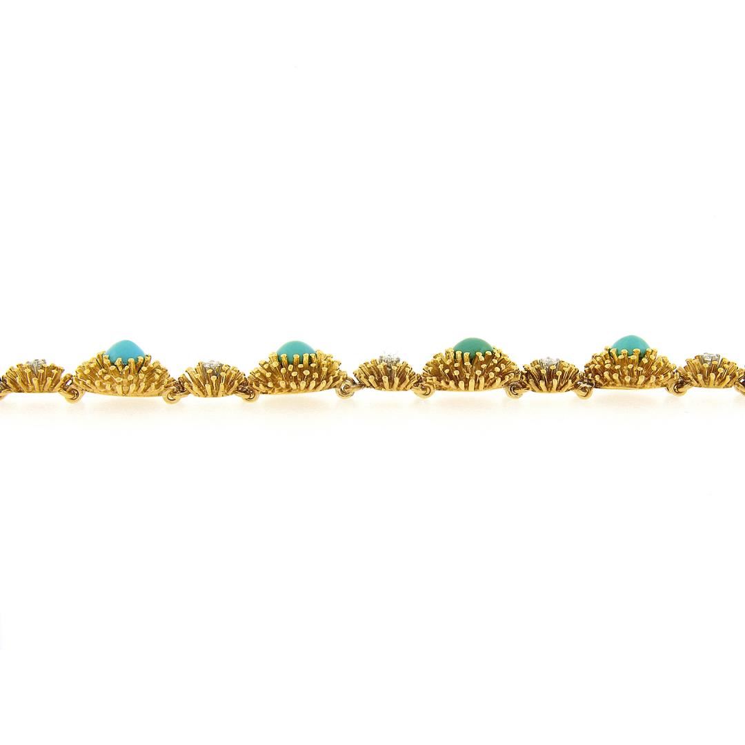 A vintage solid 18k yellow gold handmade link bracelet, with 7 round brilliant cut natural diamonds (F/G- VS1/VS2 ; 0.45ctw), alternated with 7 round cabochon cut natural turquoises (6.9mm each). It weighs a total of 44.71 grams, measures 16mm wide, and measures 7 inches in length.