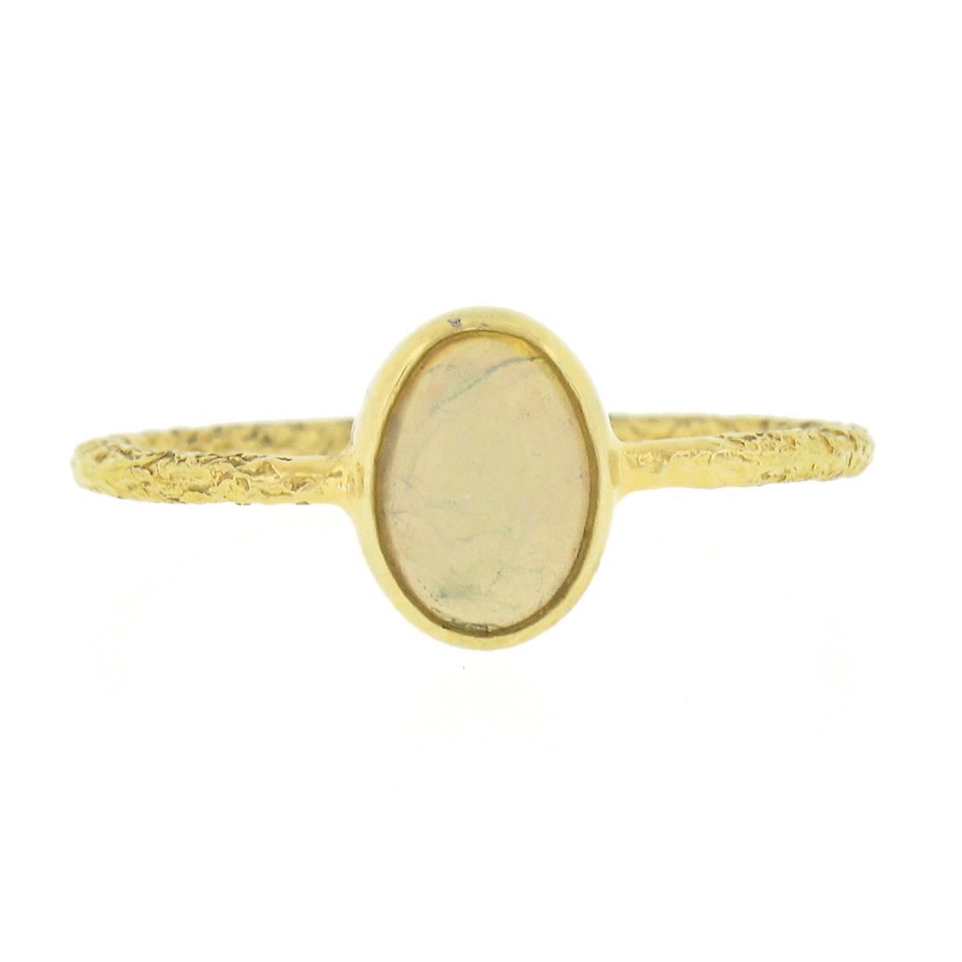 A vintage handmade solid 18k yellow gold solitaire ring, with 1 oval cabochon cut natural opal (6.5x4.5mm). The ring is size 6.5, weighs a total of 1.45 grams, and measures 8.2mm wide.