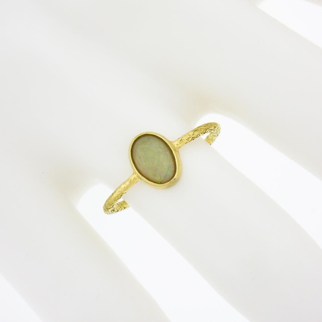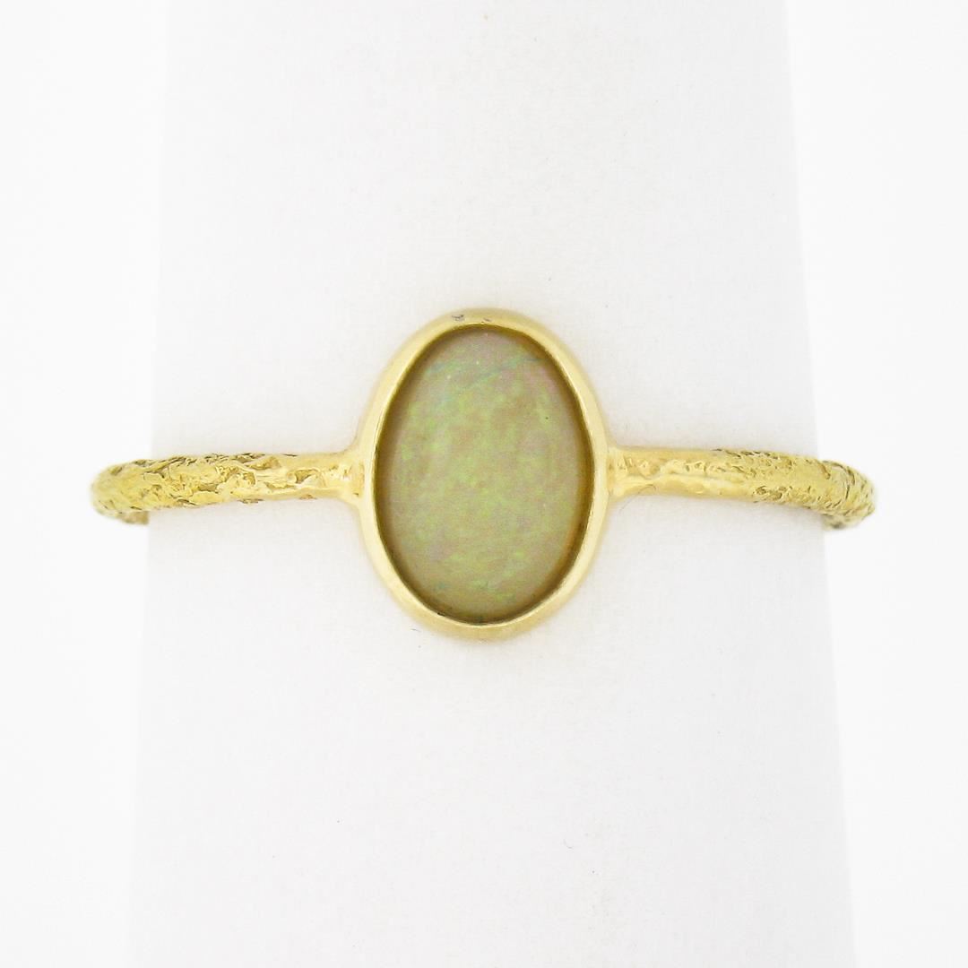 A vintage handmade solid 18k yellow gold solitaire ring, with 1 oval cabochon cut natural opal (6.5x4.5mm). The ring is size 6.5, weighs a total of 1.45 grams, and measures 8.2mm wide.