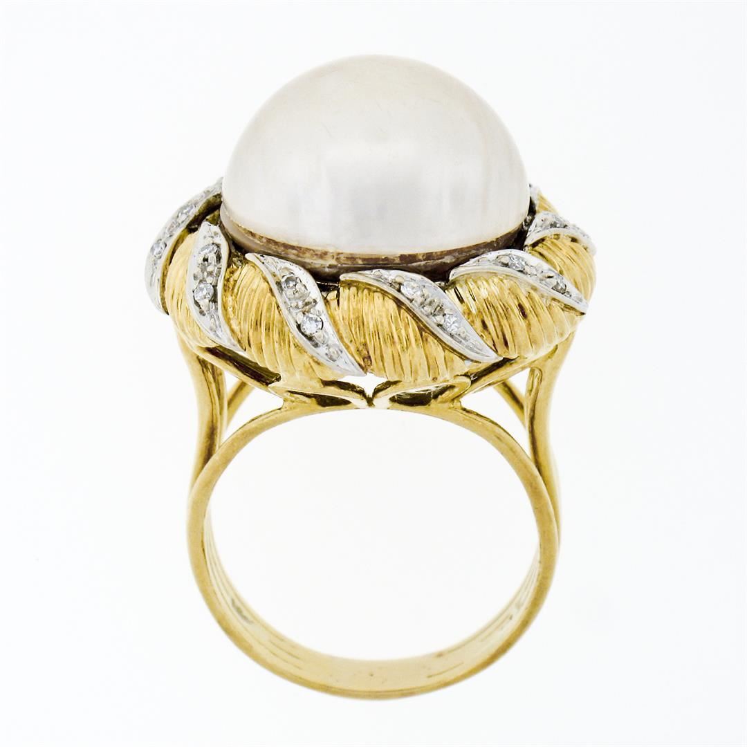 A vintage handmade 18k yellow and white gold swirl ring featuring a round white cultured mabe pearl (16.0mm) and 20 round single cut diamonds (G/H - VS2; 0.25ctw). The ring is size 7.5, weighs a total of 15.13 grams, and measures 23.7mm wide.