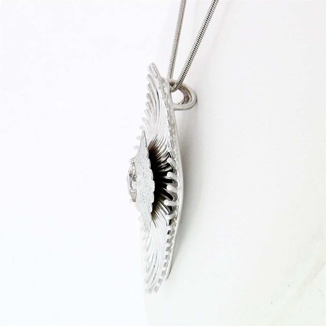 A vintage, handmade, solid 18k white gold wire pendant with 1 round brilliant cut natural diamond (I - VS1; 0.94ct). 18 inch snake link chain, 12.25 grams total weight, pendant measures 37.1x31.1mm.