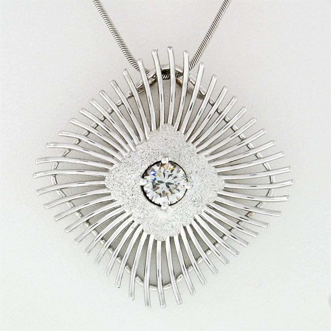A vintage, handmade, solid 18k white gold wire pendant with 1 round brilliant cut natural diamond (I - VS1; 0.94ct). 18 inch snake link chain, 12.25 grams total weight, pendant measures 37.1x31.1mm.