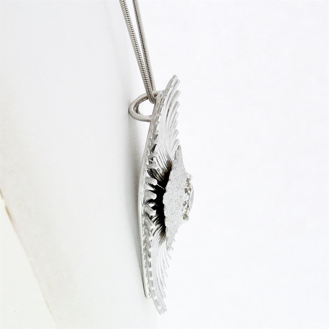 A vintage, handmade, solid 18k white gold wire pendant with 1 round brilliant cut natural diamond (I - VS1; 0.94ct). 18 inch snake link chain, 12.25 grams total weight, pendant measures 37.1x31.1mm.