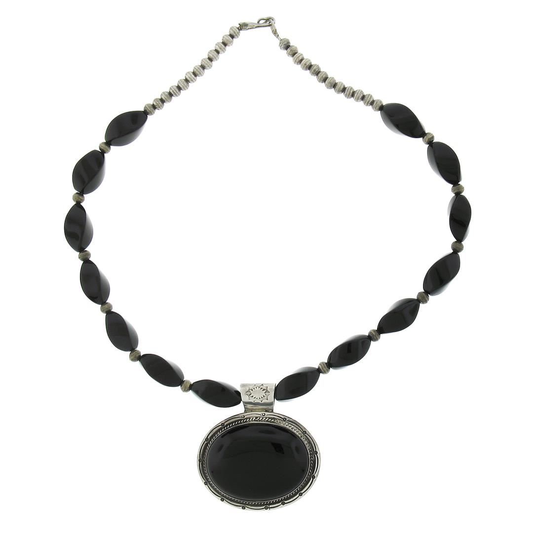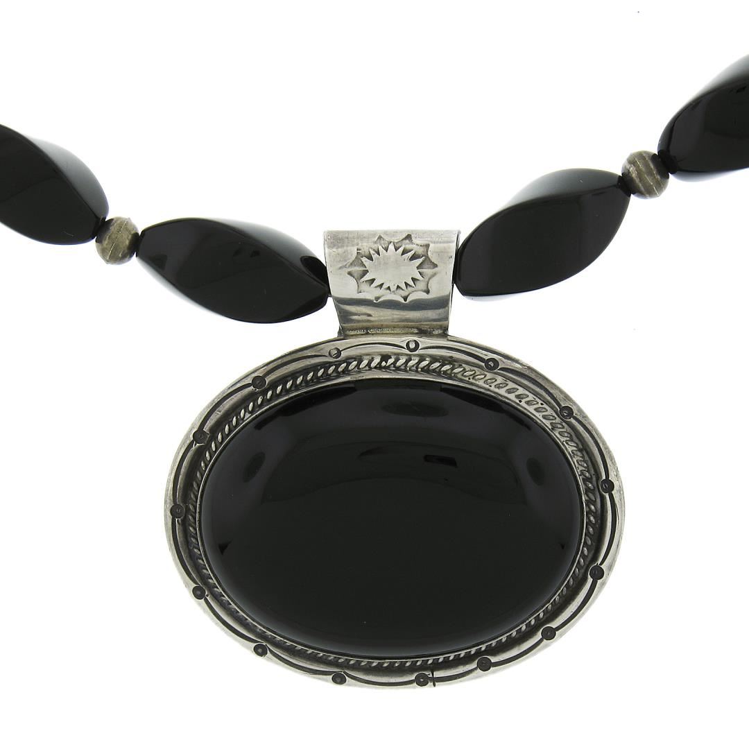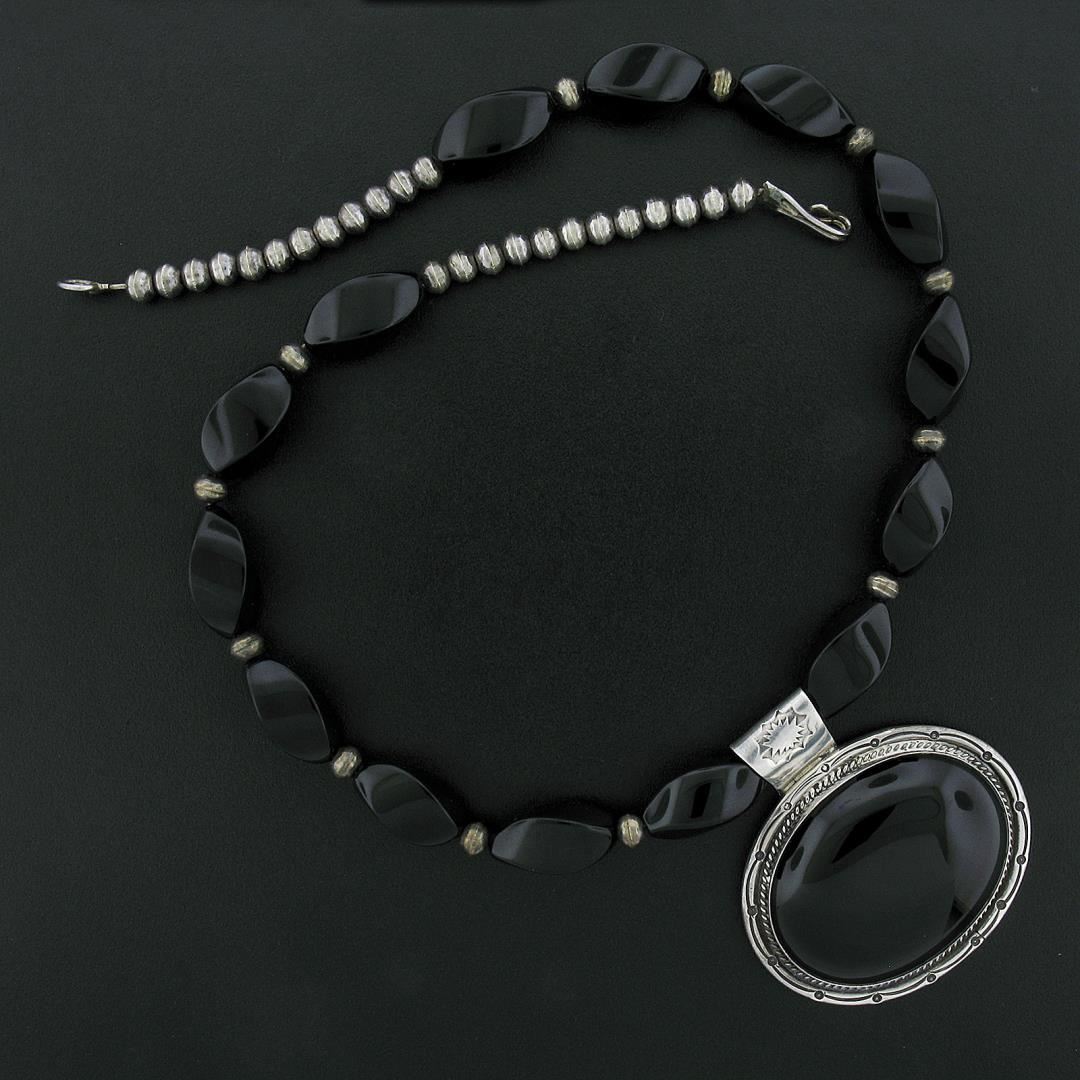 A vintage silver navajo pendant necklace, with 15 natrual black onyx (18.6x10mm), & 1 oval cabochon cut natural black onyx (39.8x29.7mm). 18 inch bead link chain, 71.3 grams total weight, pendant measures 49.4x48.6mm.