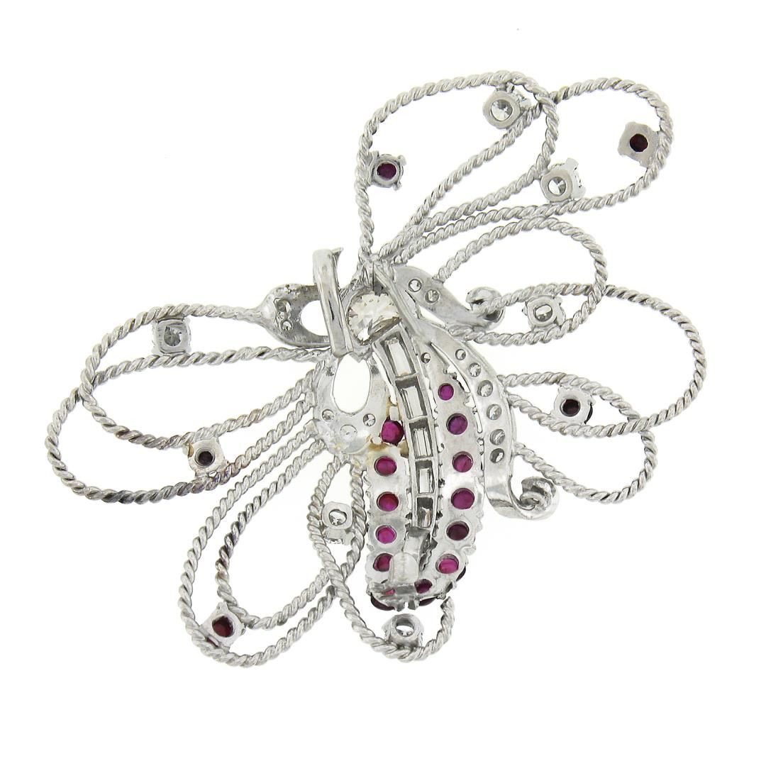 A vintage solid platinum brooch, with 18 round cabochon cut natural rubies (2.30ctw), and 30 old shield, old transitional, round brilliant, old single, old european & baguette cut natural diamonds (G/H - VS1-SI2 ; 2.45ctw). Measures 40x61mm and weighs a total of 19.11 grams.