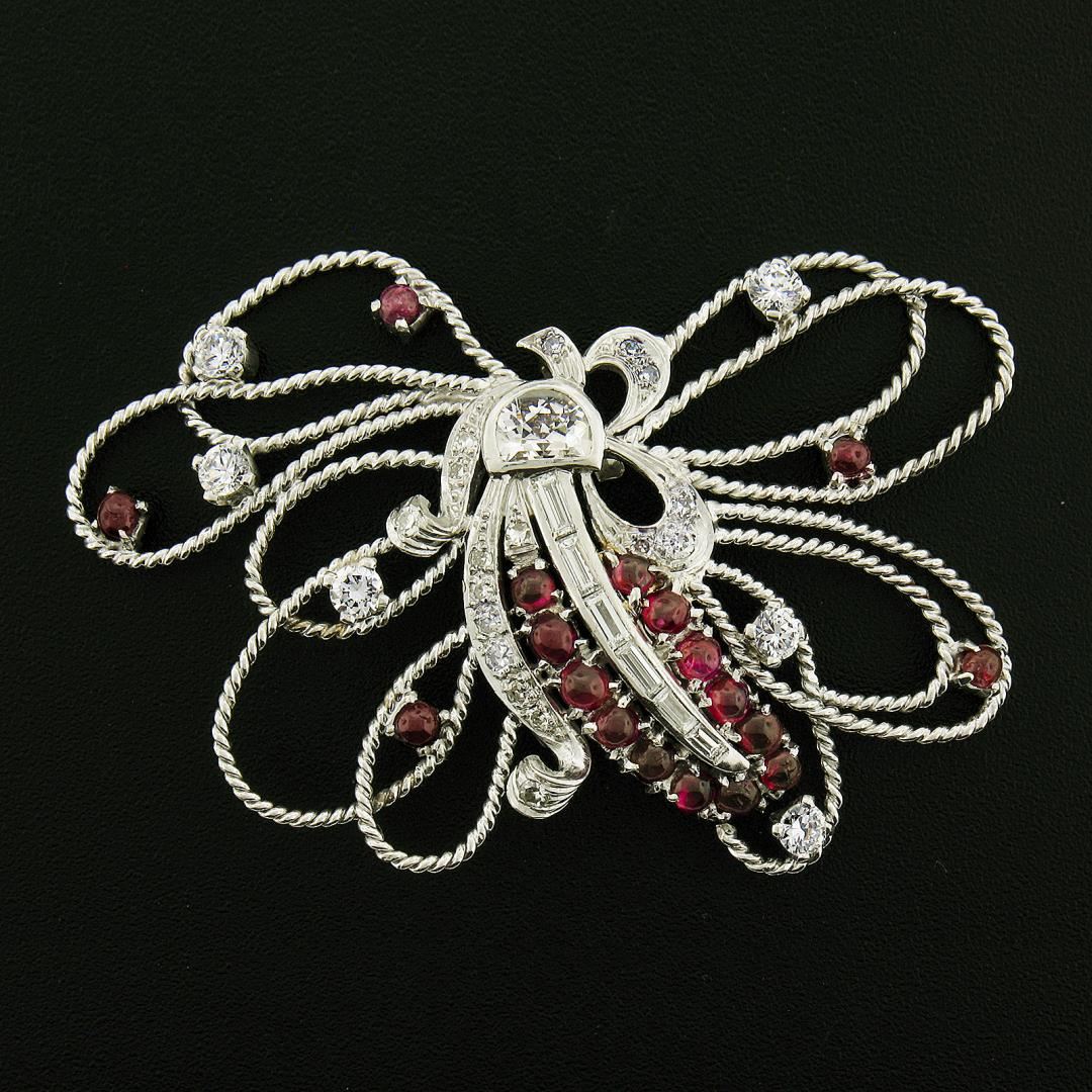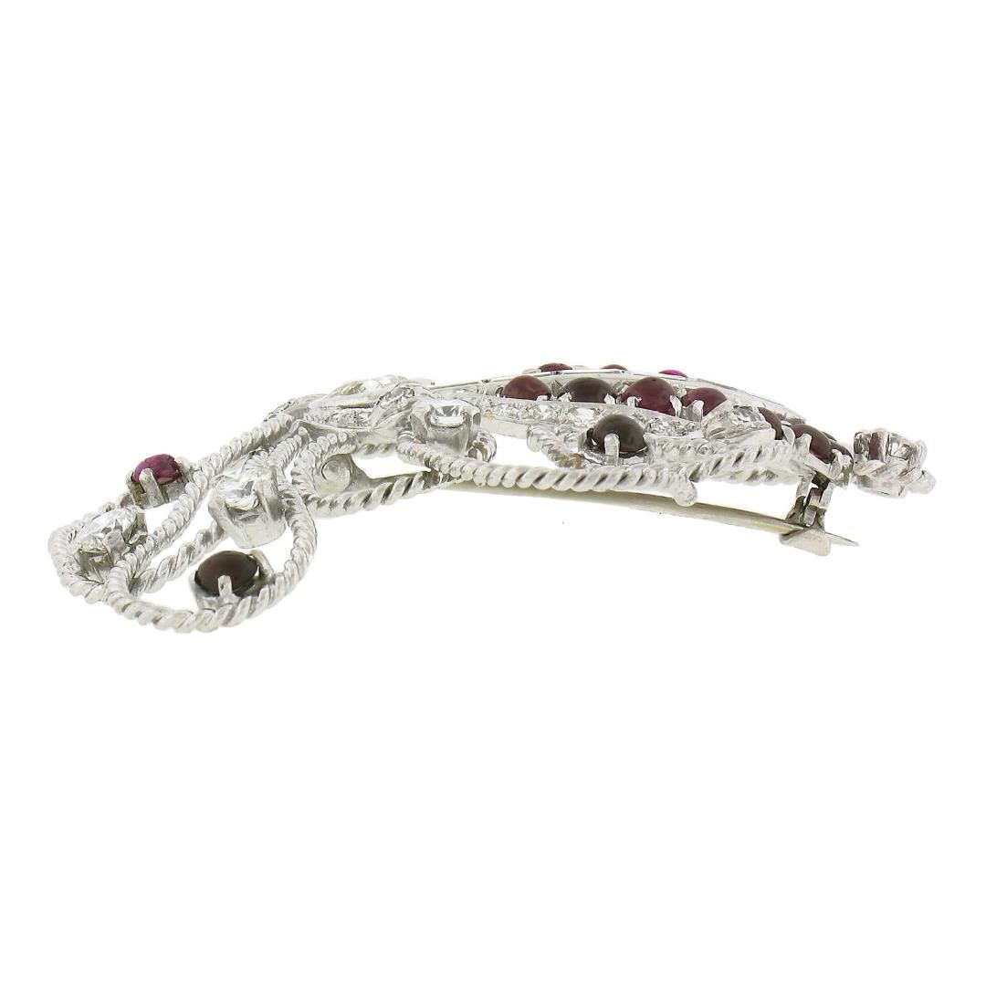 A vintage solid platinum brooch, with 18 round cabochon cut natural rubies (2.30ctw), and 30 old shield, old transitional, round brilliant, old single, old european & baguette cut natural diamonds (G/H - VS1-SI2 ; 2.45ctw). Measures 40x61mm and weighs a total of 19.11 grams.