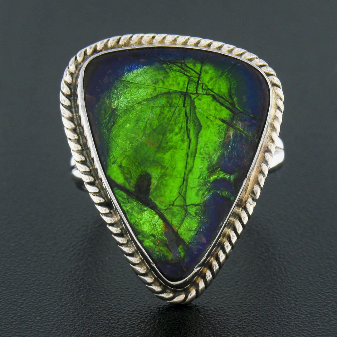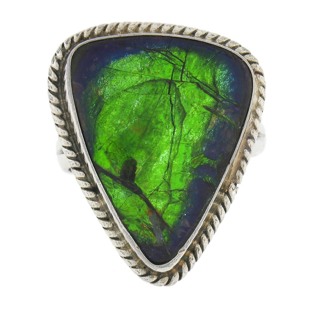 A vintage handmade solid silver ring, with 1 custom cut natural ammolite (20x16mm). The ring is size 7.0, weighs a total of 6.11 grams, and measures 23.7mm wide.