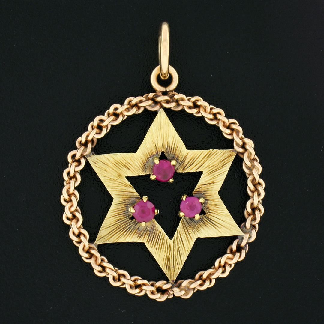 A solid 14k yellow gold star of davif circle charm pendant, with 3 old round cut red stones (2.65mm each). The pendant weighs a total of 2.88 grams, measures 33.90x24.75mm including the bail, and the inside of the bail measures 5.1mm.