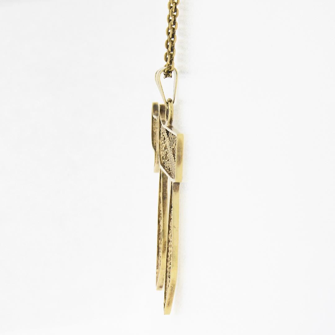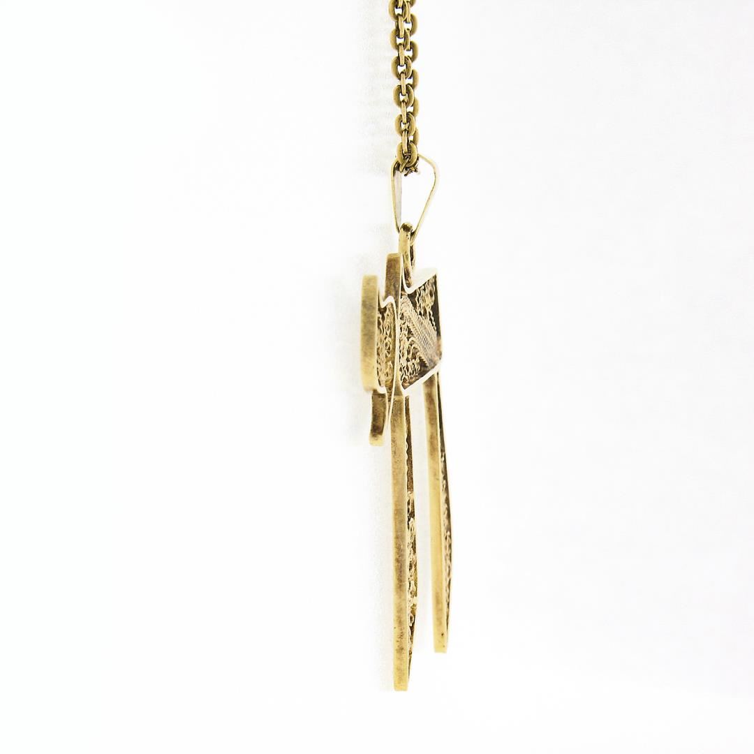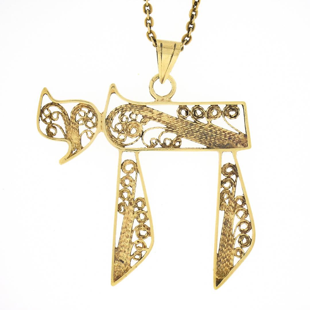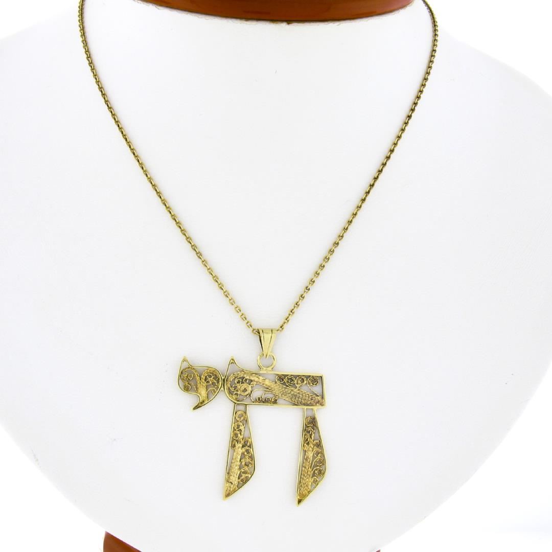 Vintage Israeli 14K Gold Wire Open Work Large Chai Symbol Charm Pendant w/ Chain