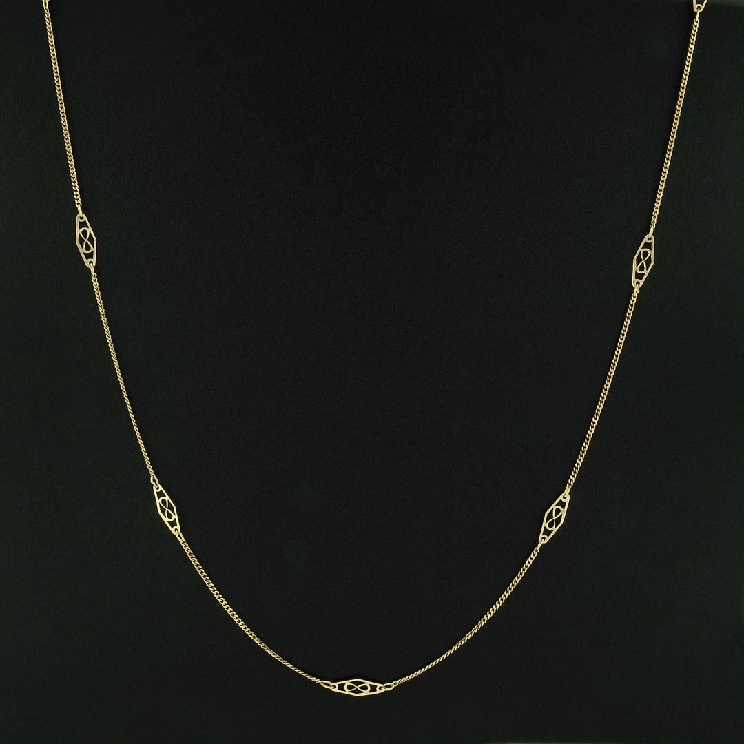 A vintage italian solid 14k yellow gold station necklace. It weighs a total of 4.94 grams, measures 5mm wide, and measures 27.5 inches in length.