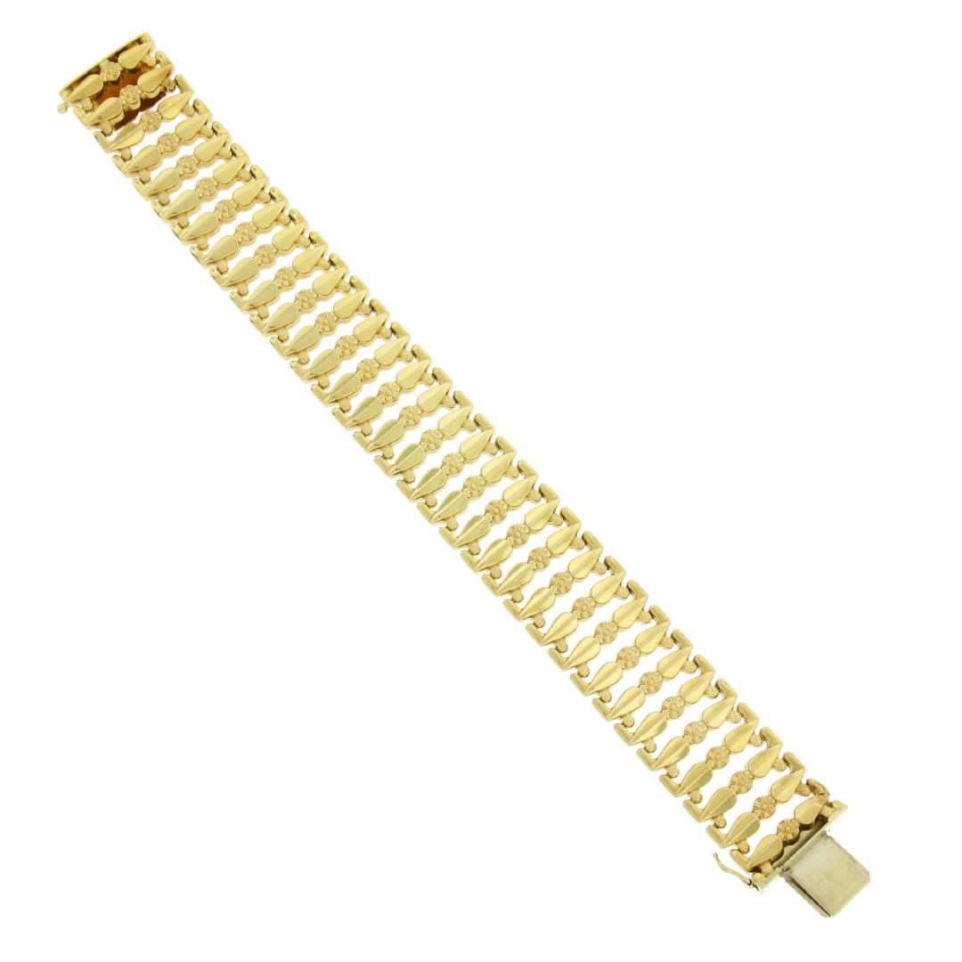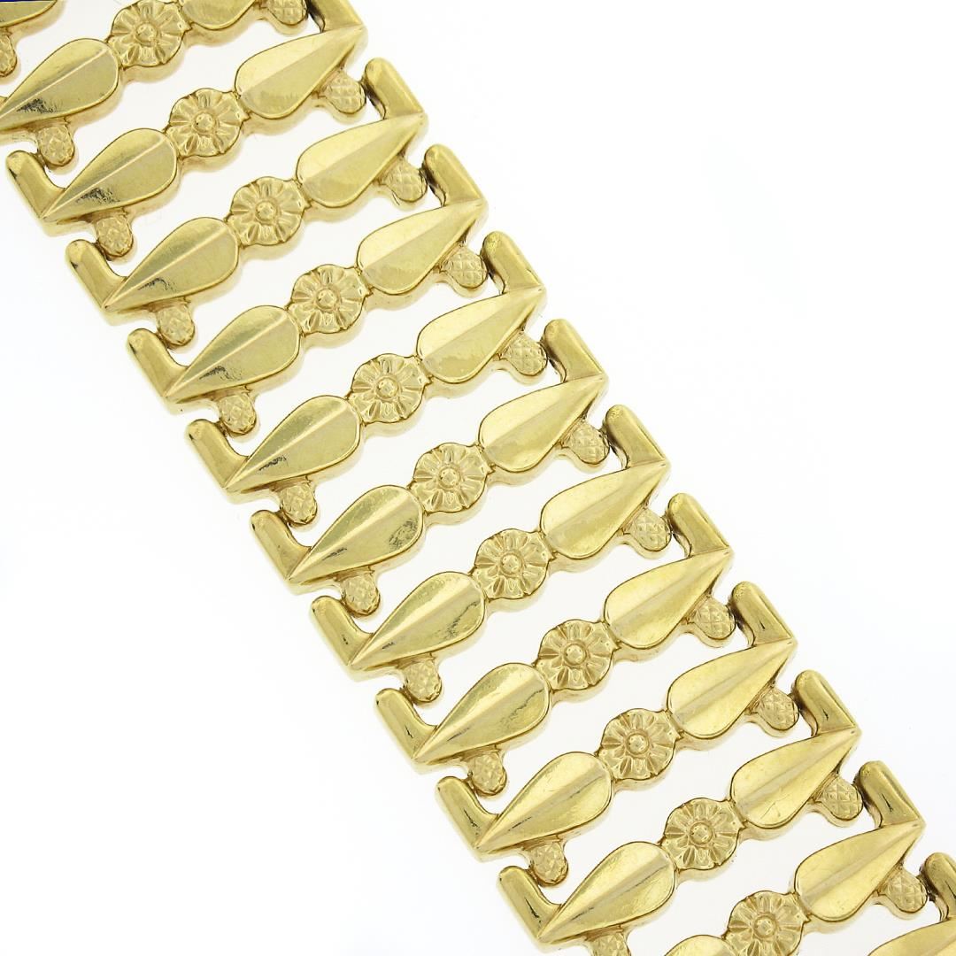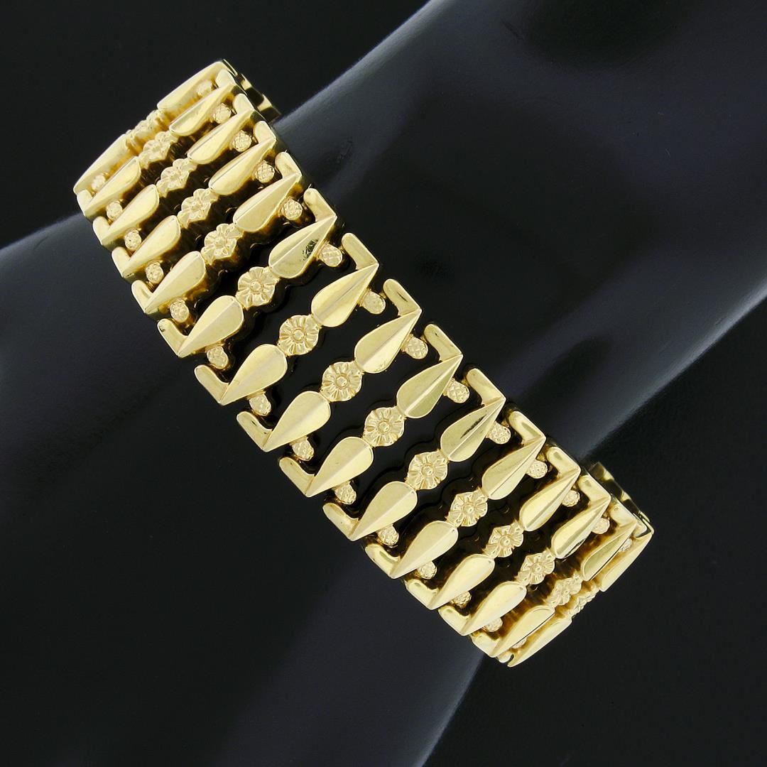 A vintage solid 18k yellow gold wide strap bracelet. It weighs a total of 31.20 grams, measures 19.8mm wide, and measures 6.75 inches in length.