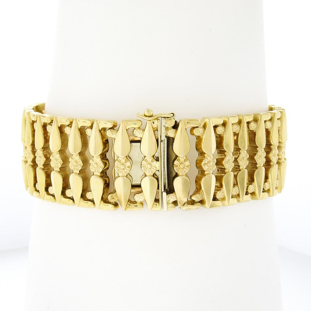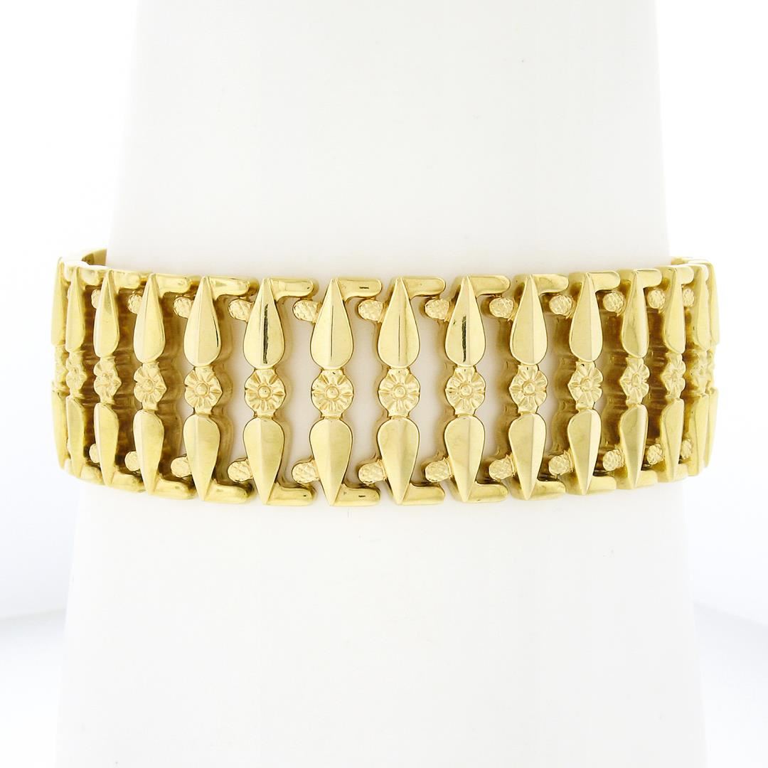Vintage Italian 18K Gold Repousse Work w/ Floral Center Wide Strap Bracelet