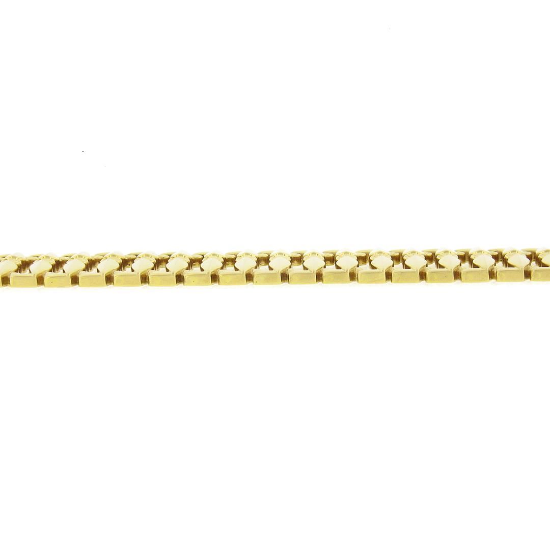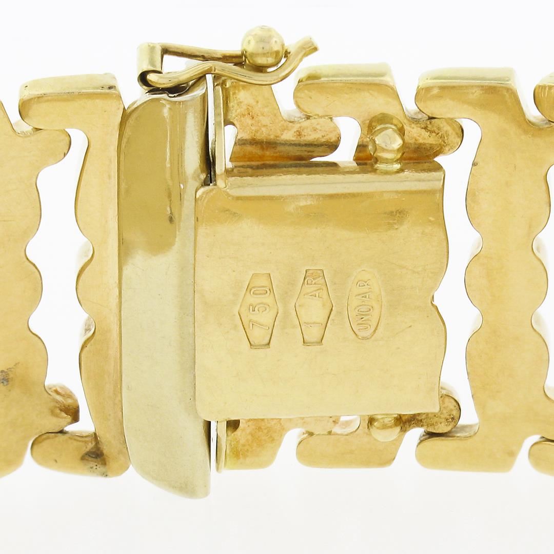 A vintage solid 18k yellow gold wide strap bracelet. It weighs a total of 31.20 grams, measures 19.8mm wide, and measures 6.75 inches in length.