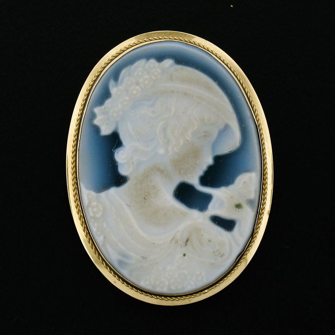 A vintage solid 18k yellow gold brooch pendant, with 1 oval shape carved natural agate ( 25.0x18.0mm). Measures 27.40x20.60mm and weighs a total of 5.77 grams.