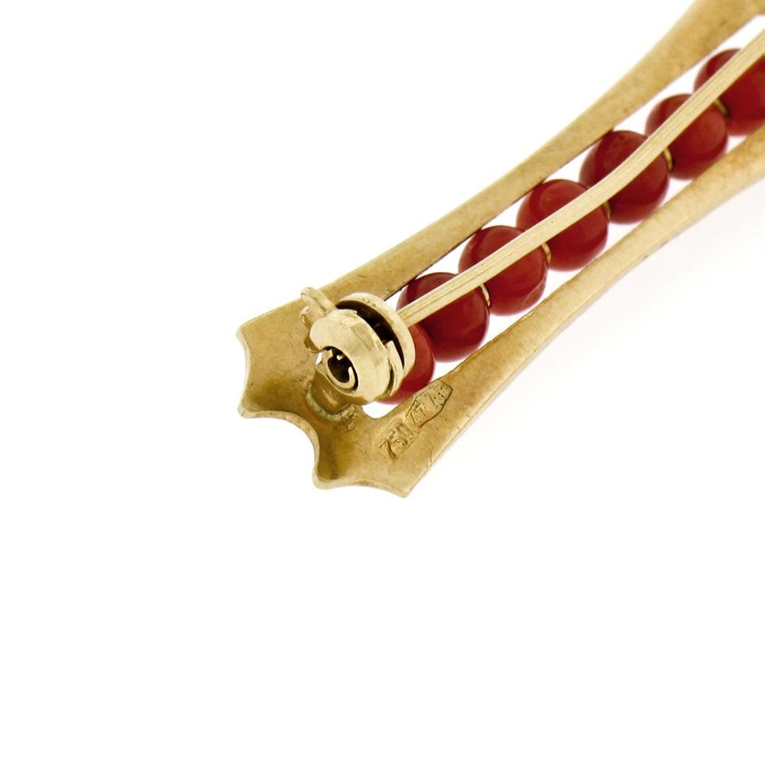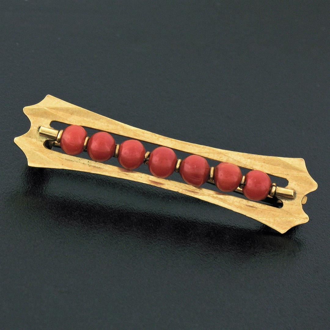 A vintage solid 18k yellow gold bar pin brooch, faeturing 7 round nead shape natural coral (3.50x4.0mm). Measures 10.0x39.50mm and weighs a total of 3.42 grams.
