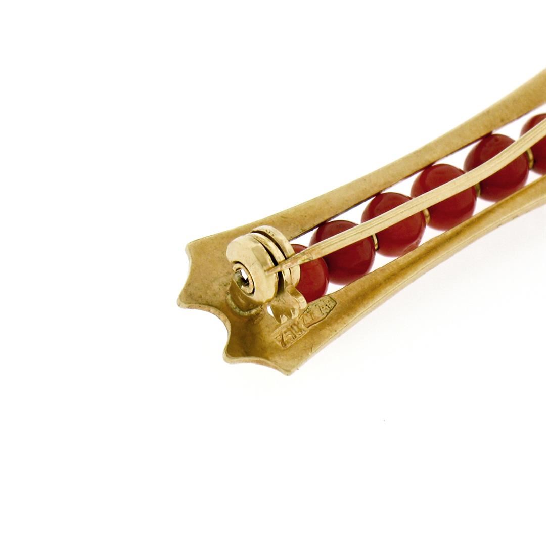 A vintage solid 18k yellow gold bar pin brooch, faeturing 7 round nead shape natural coral (3.50x4.0mm). Measures 10.0x39.50mm and weighs a total of 3.42 grams.