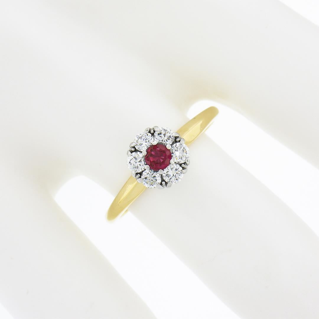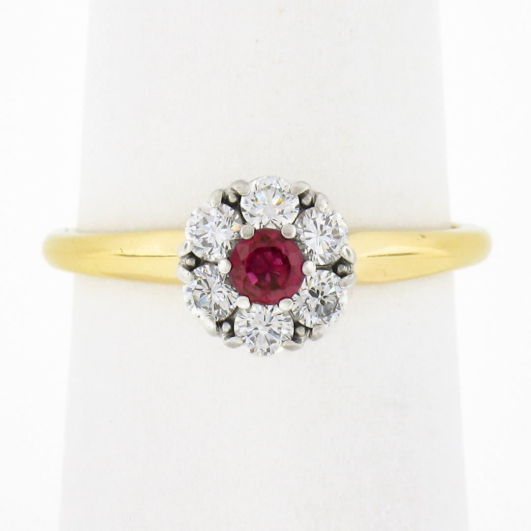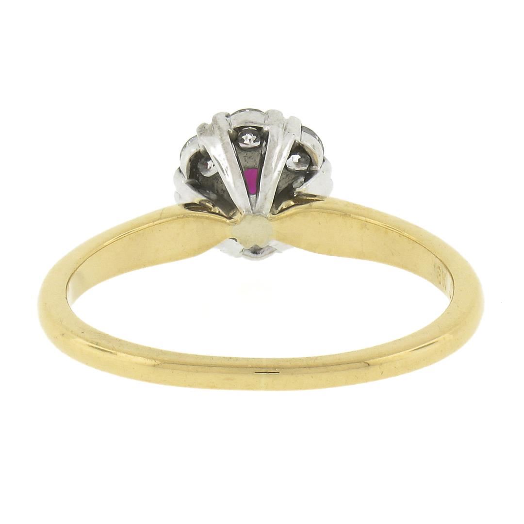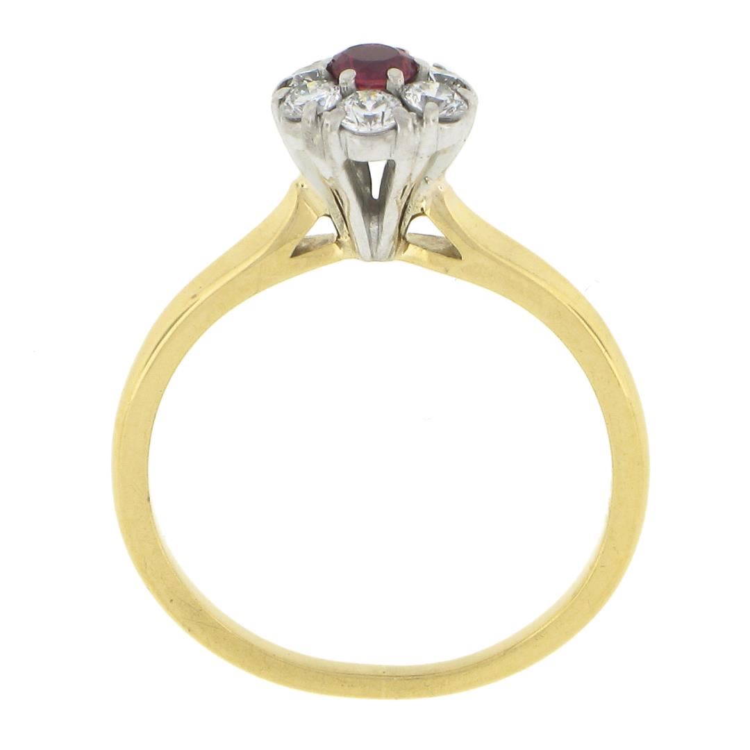A vintage solid 18k yellow & white gold ring by JABEL, with 1 round cut natural ruby (3.1mm - 0.15ct ), and a halo of 6 round cut natural diamonds (F/G - VS1/VS2 ; 0.25ctw). The ring is size 6.0, weighs a total of 2.95 grams, and measures 7.5mm wide.