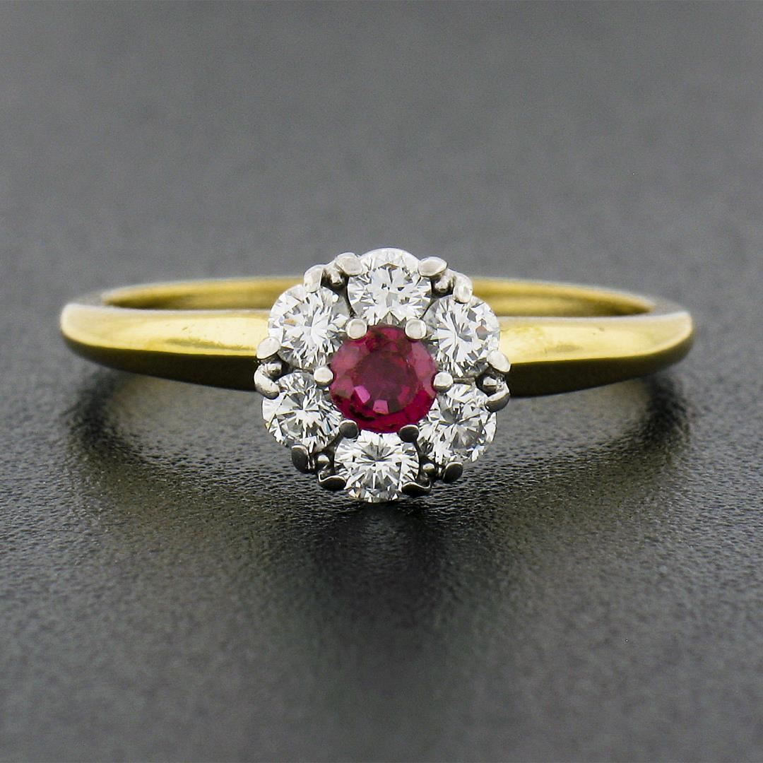 A vintage solid 18k yellow & white gold ring by JABEL, with 1 round cut natural ruby (3.1mm - 0.15ct ), and a halo of 6 round cut natural diamonds (F/G - VS1/VS2 ; 0.25ctw). The ring is size 6.0, weighs a total of 2.95 grams, and measures 7.5mm wide.