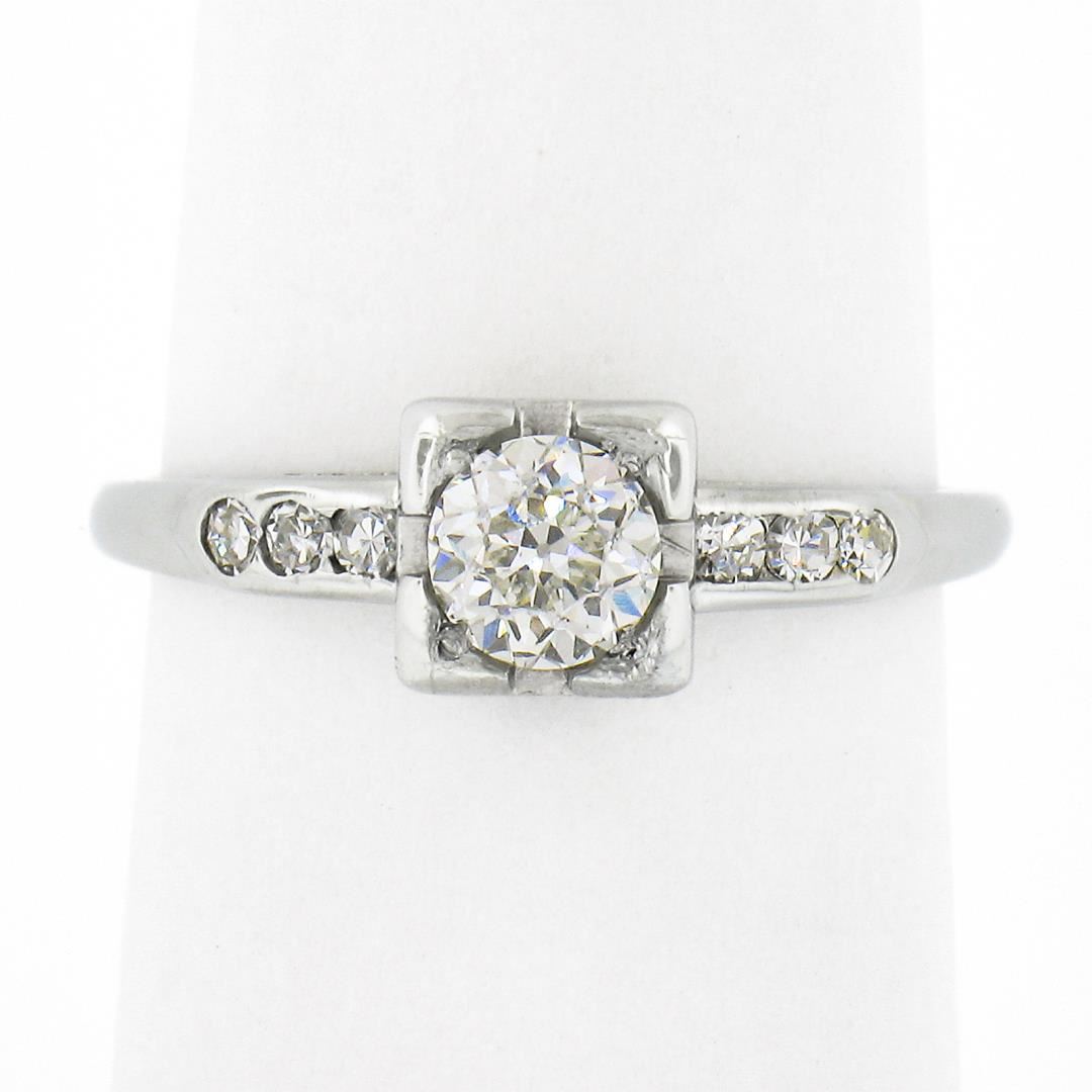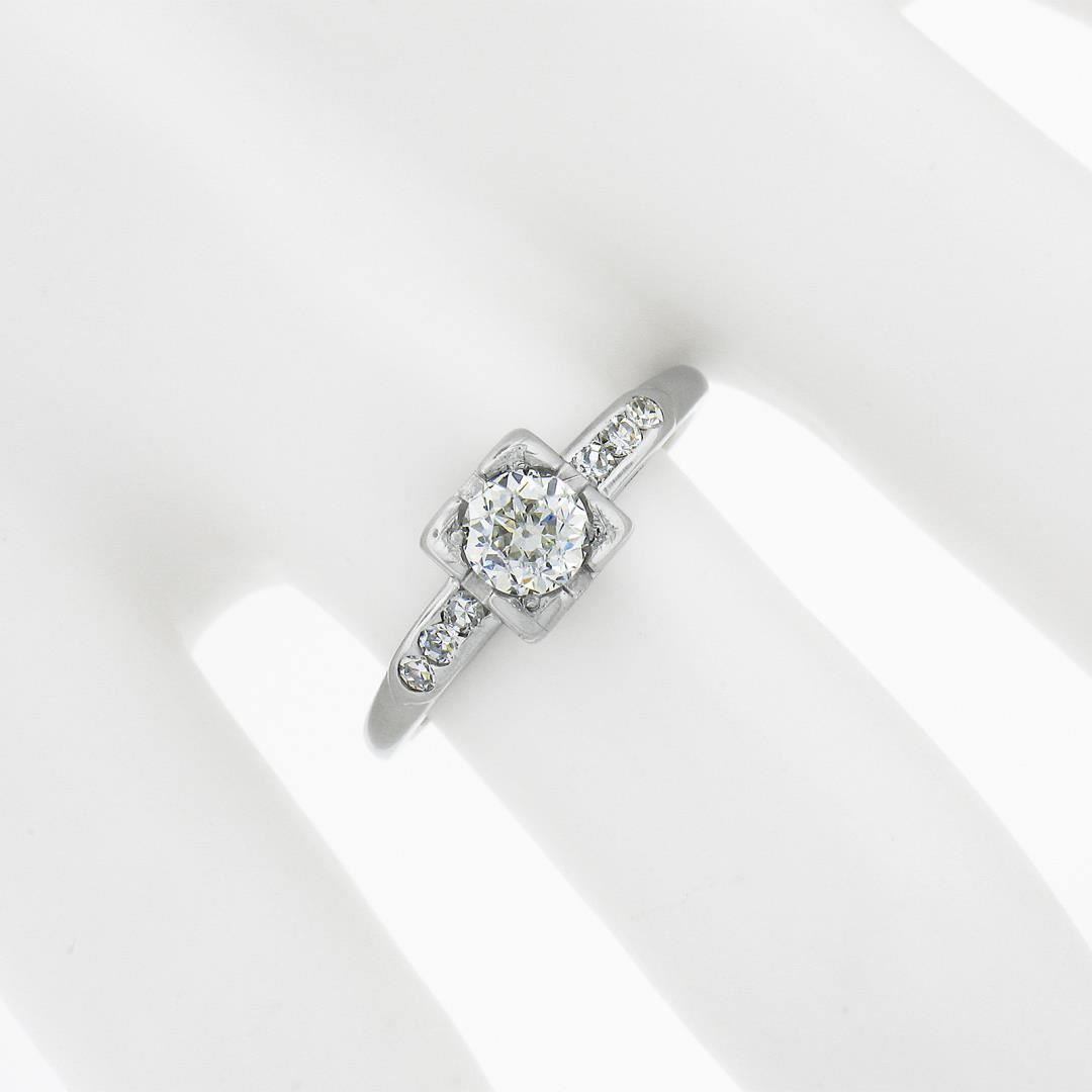 A vintage solid 18k white gold engagement ring by JABEL, featuring 1 GIA graded old European cut natural diamond (J - SI1 ; 0.49ct), and 6 old single cut natural diamonds (G-H - VS2-SI1 ; 0.08ctw). The ring is size 6.0, weighs a total of 2.05 grams, and measures 6mm wide. Comes with all original relevant certifications.