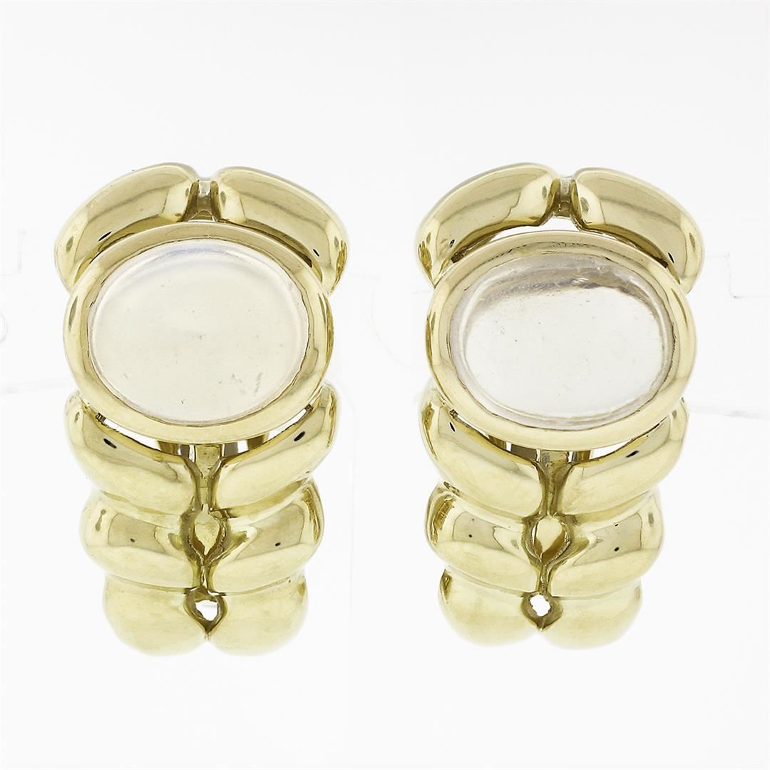 A vintage solid 18k yellow gold cuff earrings by Kaufmann De Suisse, featuring 2 oval cabochon cut natural moonstone (10.45x8.8mm).The earrings measure approximately 25.3x14.65mm and weigh a total of 23.67 grams.