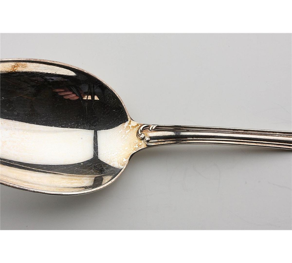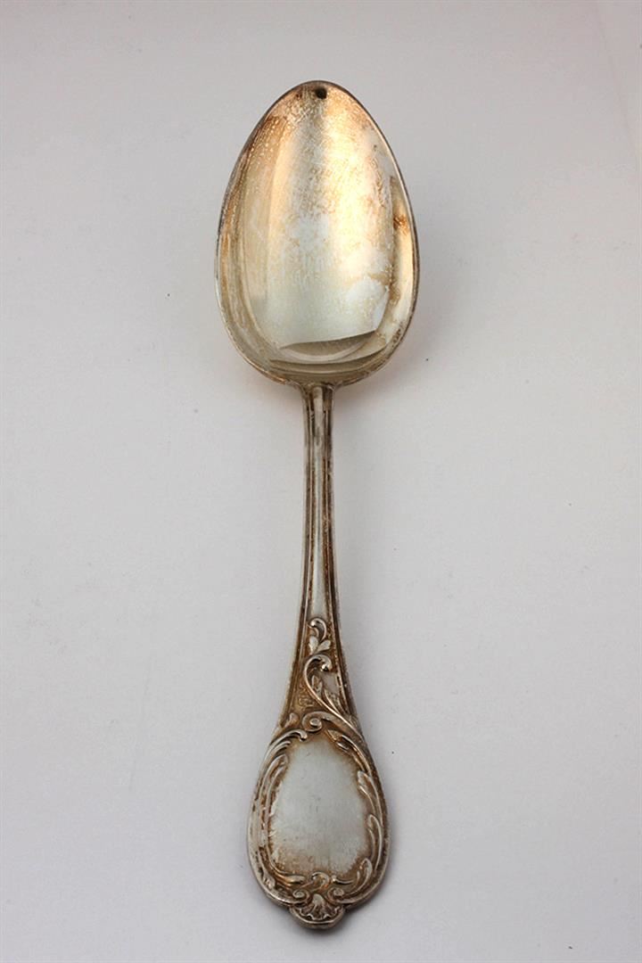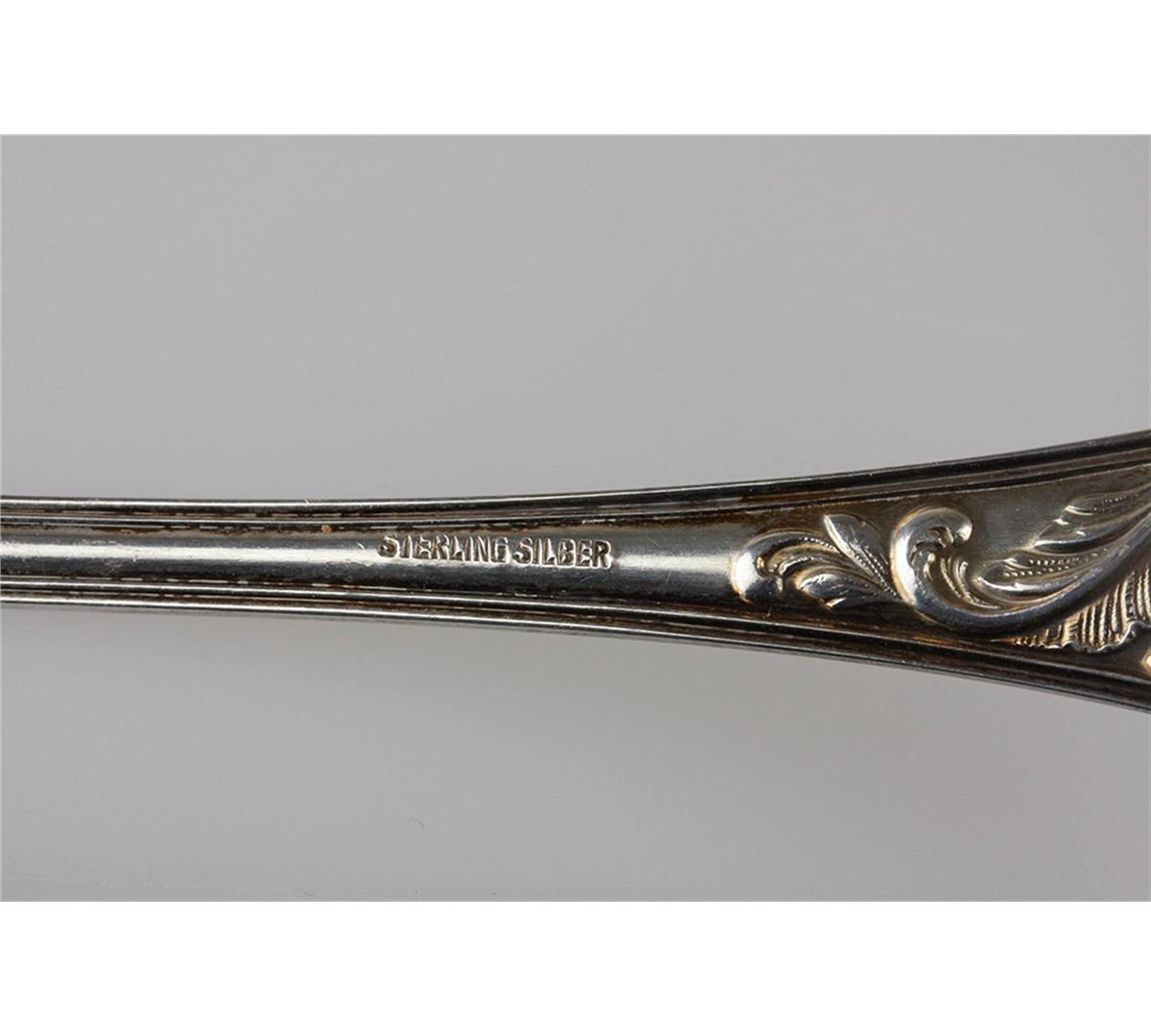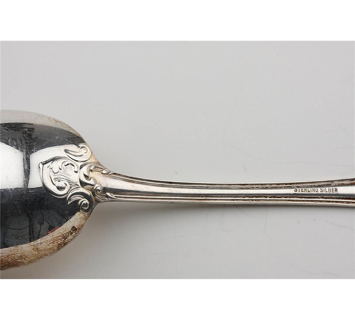 This is a sterling silver large dinner spoon in the "Rococo" pattern by the famous silver smiths Koch and Bergfeld! Measures 8.5". No monogram. Retails for $410.00. Valued between $410.00 and $450.00.
