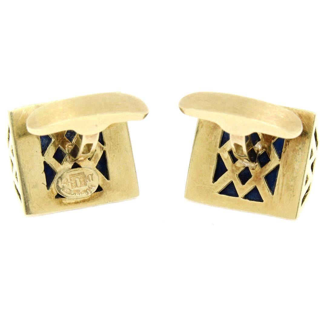 A vintage solid 14k yellow gold cufflinks by La Triomphe, featuring 2 trapezoidal cut natural lapis (15.10x12.15mm). These cuff links have a Swivel Back design with a clearance of 10.70mm, weigh a total of 19.15 grams, and the front panels measure 16.85x18.10mm.