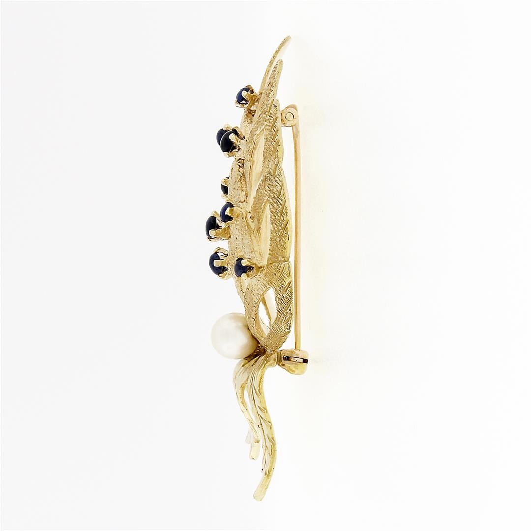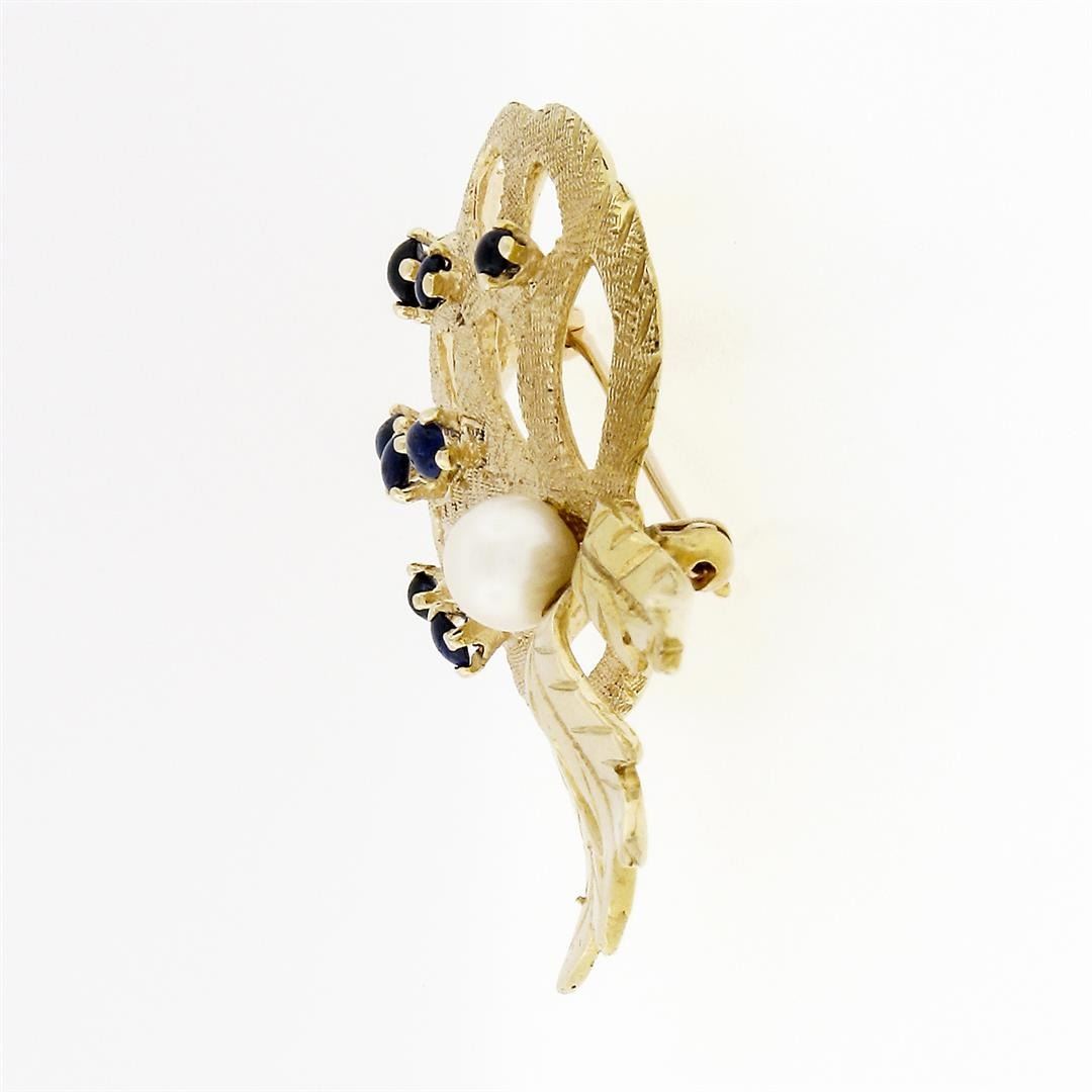 A vintage solid 14k yellow gold flower leaf pin brooch, with 9 round cabochon cut natural sapphires (3.2 to 2.5mm - 1.30ctw), & 1 round shape cultured pearl (6.00mm). Measures 38.9x61.0mm mm and weighs a total of 12.70 grams.