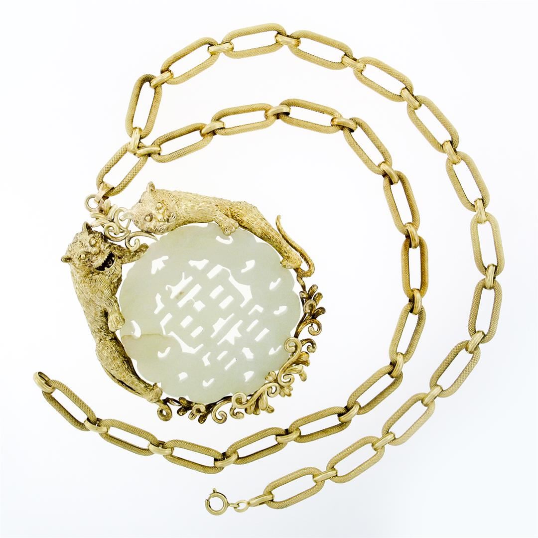 A vintage solid 14k yellow gold pendant with 1 pierced round natural nephrite jade (54.0mm). 22 inch oval link chain, 95.01 grams total weight, pendant measures 86.58x71.80mm.