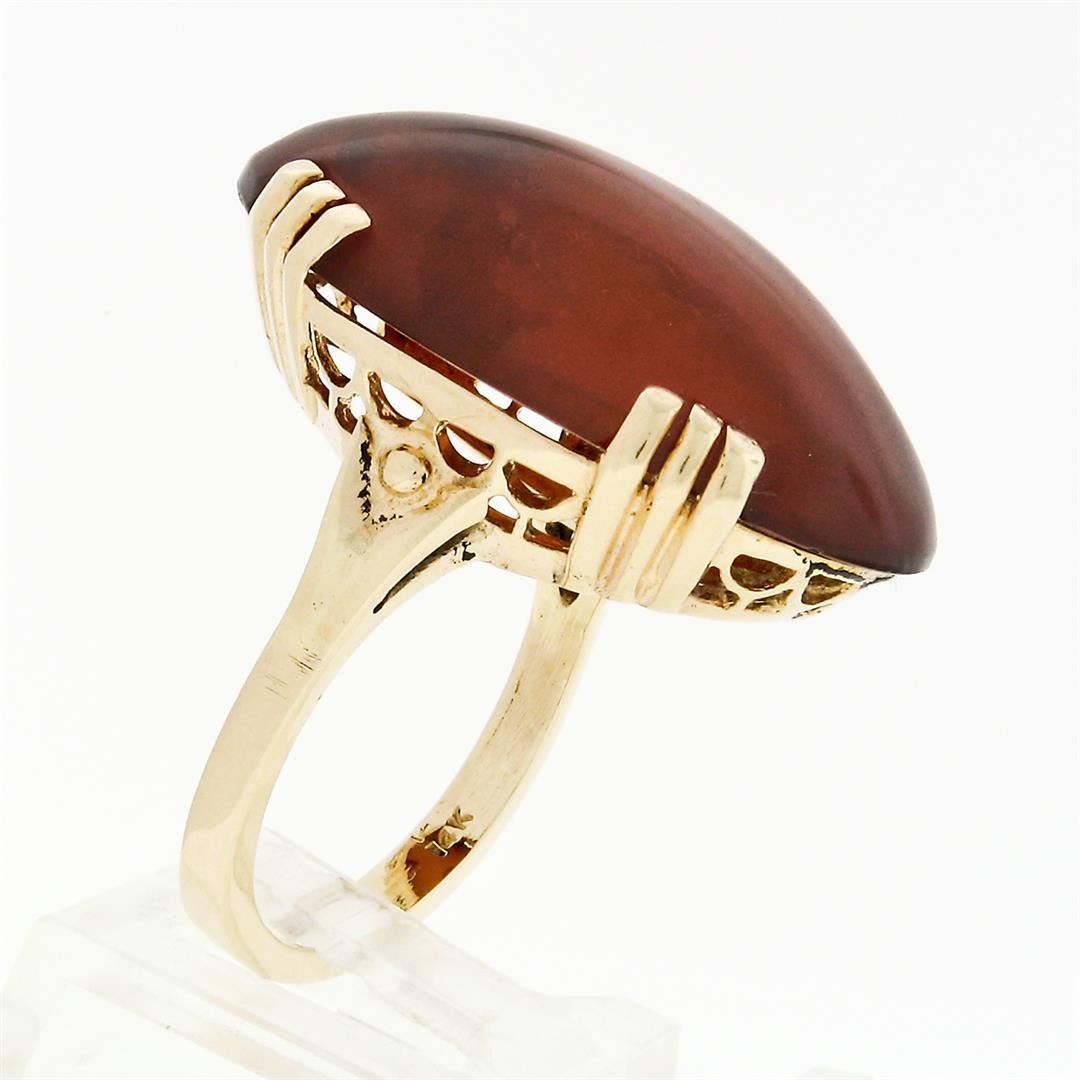 A vintage solid 14k yellow gold statement ring with 1 large oval cabochon cut natural amber (30.5x18.1mm). The ring is size 9.5, weighs a total of 8.96 grams, and measures 30.5mm wide.